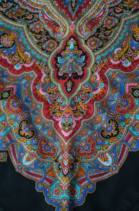 А про листики, и весь узор - да, он в хаки, но если хаки, то очень светлый и такой бежевато-сепийный оттенок этого цвета. А так как его, этого узора много, то в скрутке он активно работает. Лимонный фон создаёт только лишь свечение шали, а основную структуру рисует узор. Тань, и сиреневого много! Как мы любим.