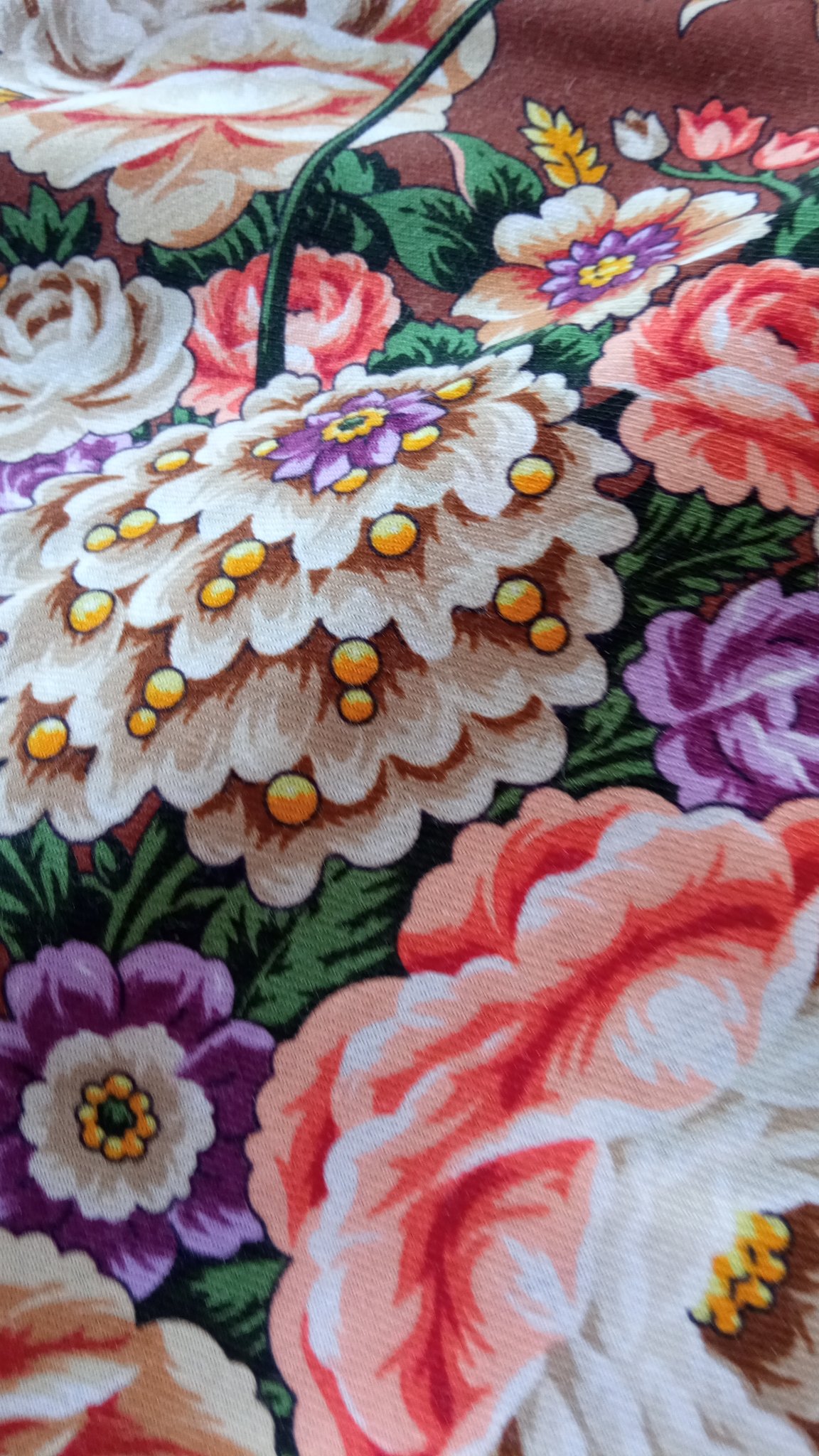 А про листики, и весь узор - да, он в хаки, но если хаки, то очень светлый и такой бежевато-сепийный оттенок этого цвета. А так как его, этого узора много, то в скрутке он активно работает. Лимонный фон создаёт только лишь свечение шали, а основную структуру рисует узор. Тань, и сиреневого много! Как мы любим.