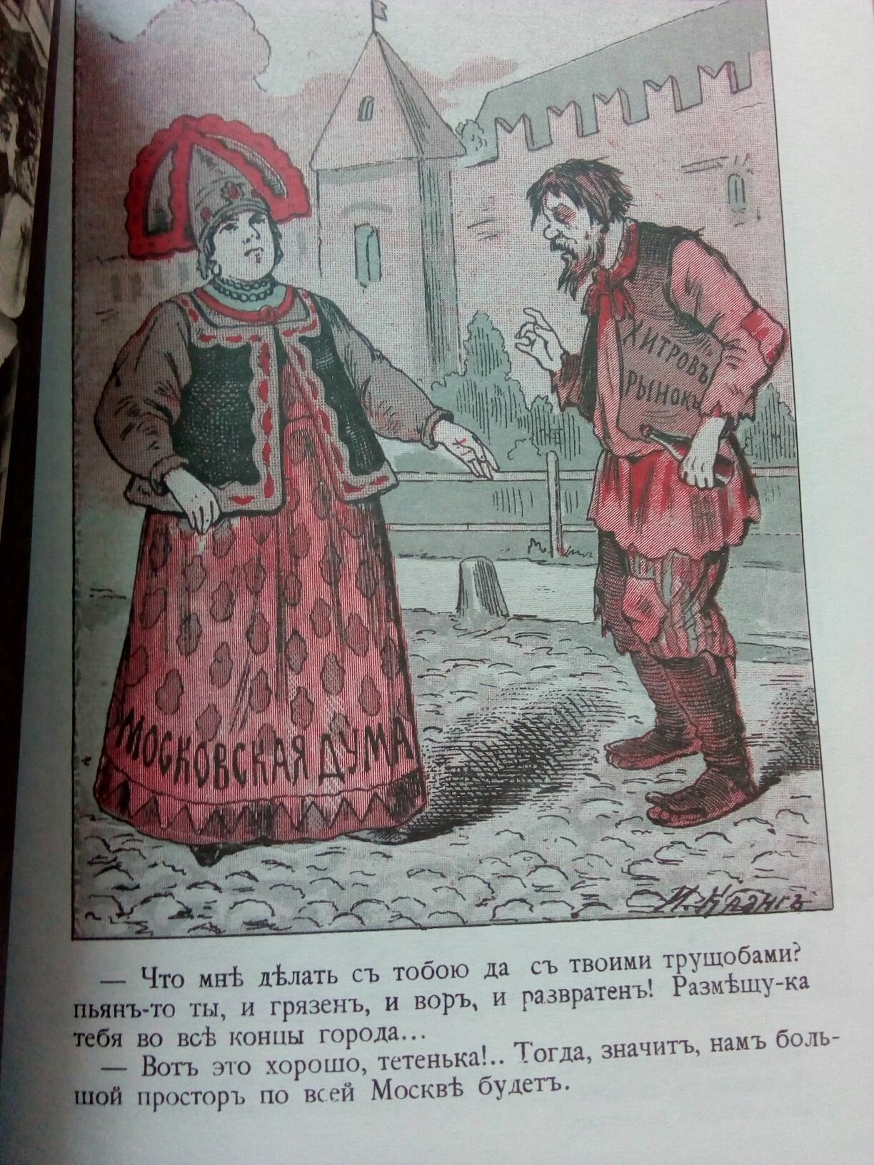 Ответ: это Московская городская Дума. Изображалась манерной немолодой барыней в кокошниках, душегреях и других элементах русского костюма прежних эпох, чтоб подчеркнуть ее консерватизм, невосприимчивость к прогрессу и вообще любым новым идеям.