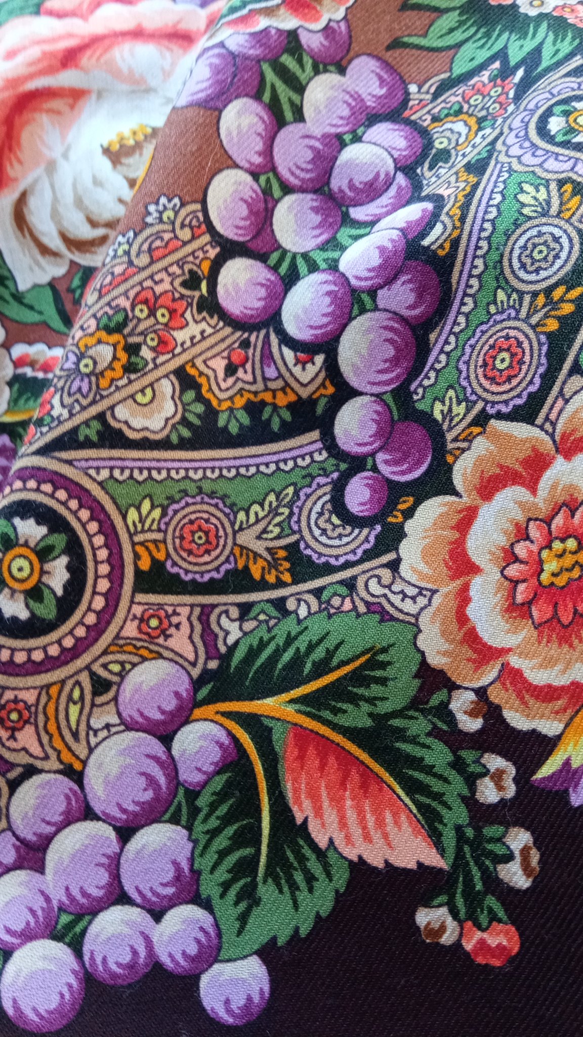 А про листики, и весь узор - да, он в хаки, но если хаки, то очень светлый и такой бежевато-сепийный оттенок этого цвета. А так как его, этого узора много, то в скрутке он активно работает. Лимонный фон создаёт только лишь свечение шали, а основную структуру рисует узор. Тань, и сиреневого много! Как мы любим.