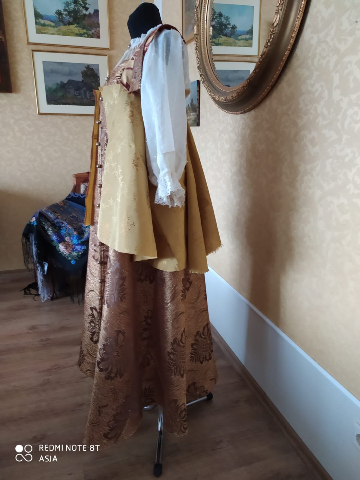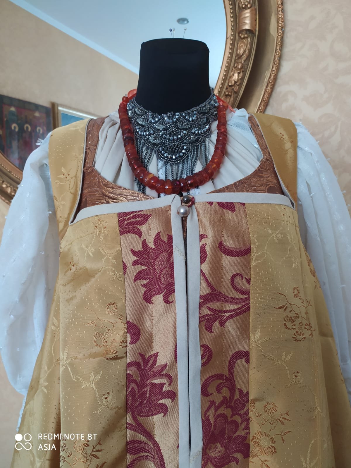 Дошила душегрею. Были музейные обмеры, в следующий раз кое-что изменю. Но вообще довольна. Шить просто, только обработка нужна тщательная,как всегда при крое - "солнце")