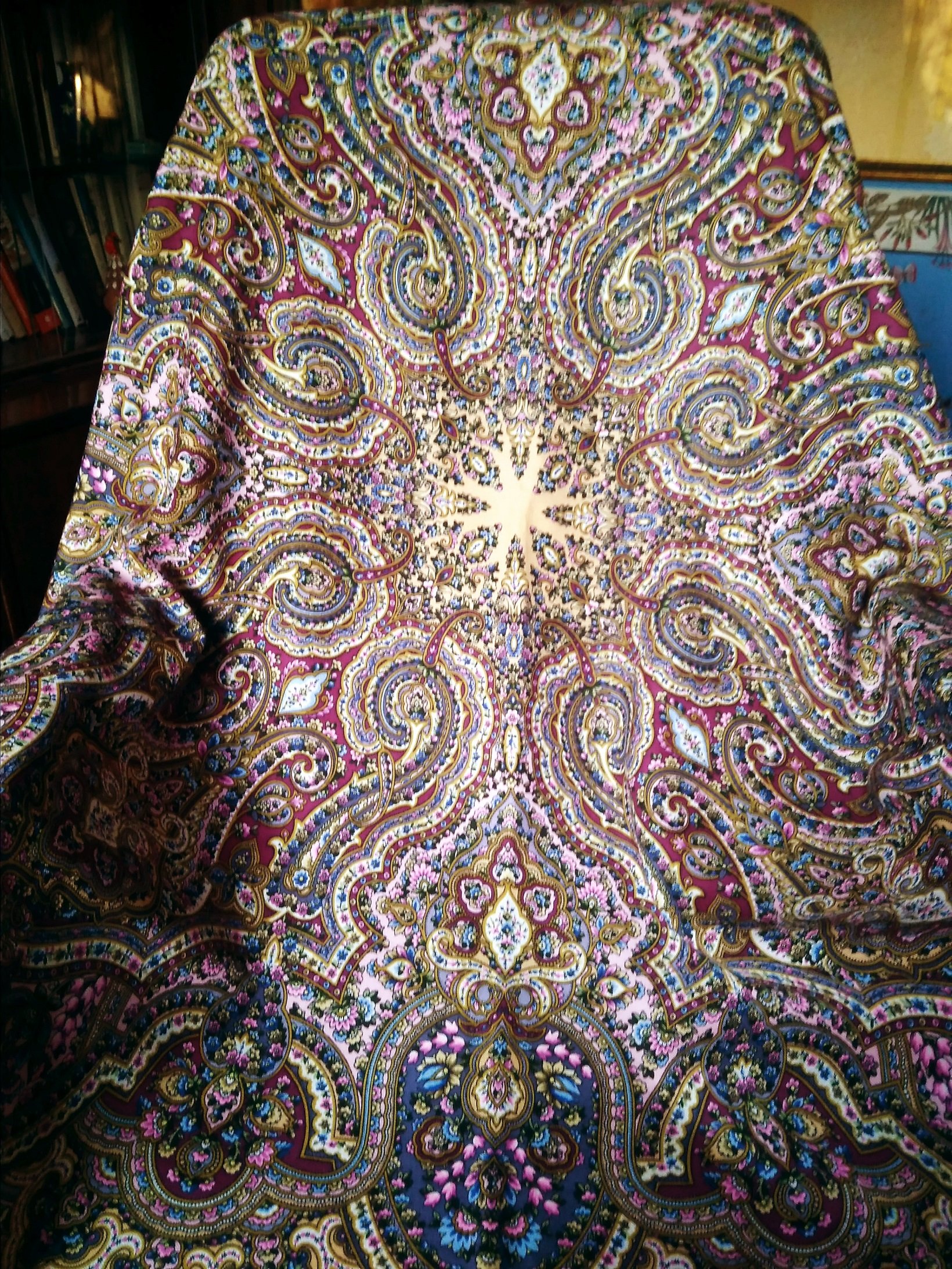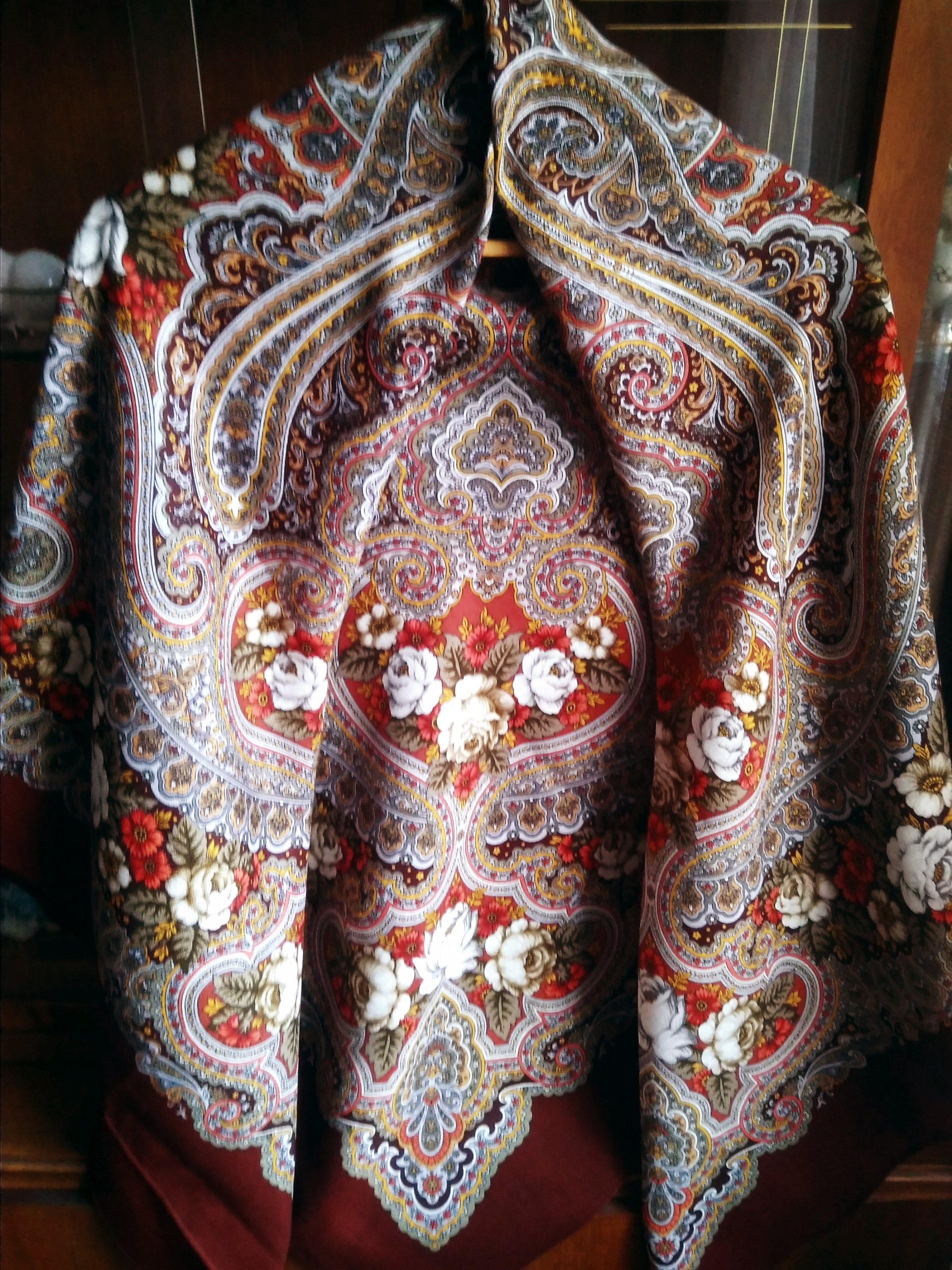На мой взгляд, прекрасный образец современного варианта традиционного белопольного русского платка. В народе более популярен роскошный 18 колорит, но для меня цветочные рисунки Белокур слишком избыточны, а на черном фоне эта барочная избыточность меня просто забивает (ногами), белый грунт делает рисунок более воздушным что ли…