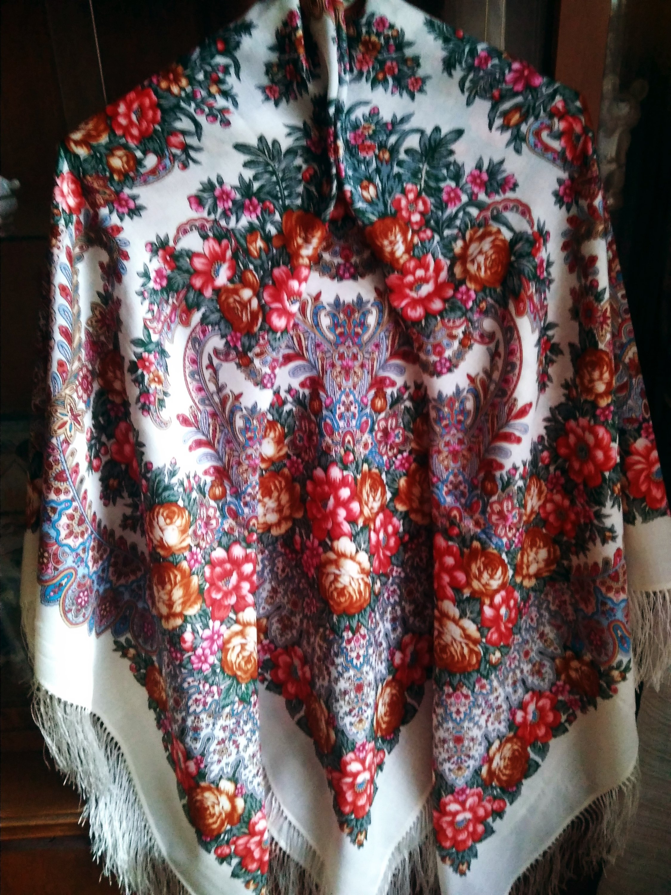 На мой взгляд, прекрасный образец современного варианта традиционного белопольного русского платка. В народе более популярен роскошный 18 колорит, но для меня цветочные рисунки Белокур слишком избыточны, а на черном фоне эта барочная избыточность меня просто забивает (ногами), белый грунт делает рисунок более воздушным что ли…