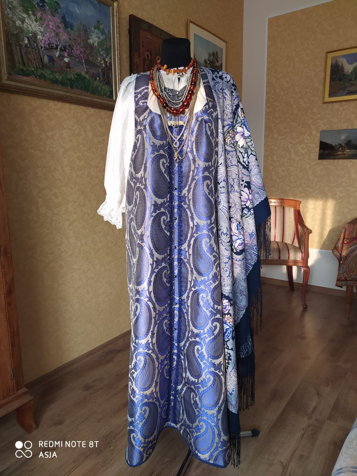 Дорогие девочки,делаю небольшую коллекцию,и то,что готово,хочу показать,а то пропала и носа не высовываю..) Васильковая ткань в жизни эффектнее,но очень трудная в работе. Надо было ее только на душегреи...но что сделано,то сделано) так что пока примерки - сарафан примеряет шали )