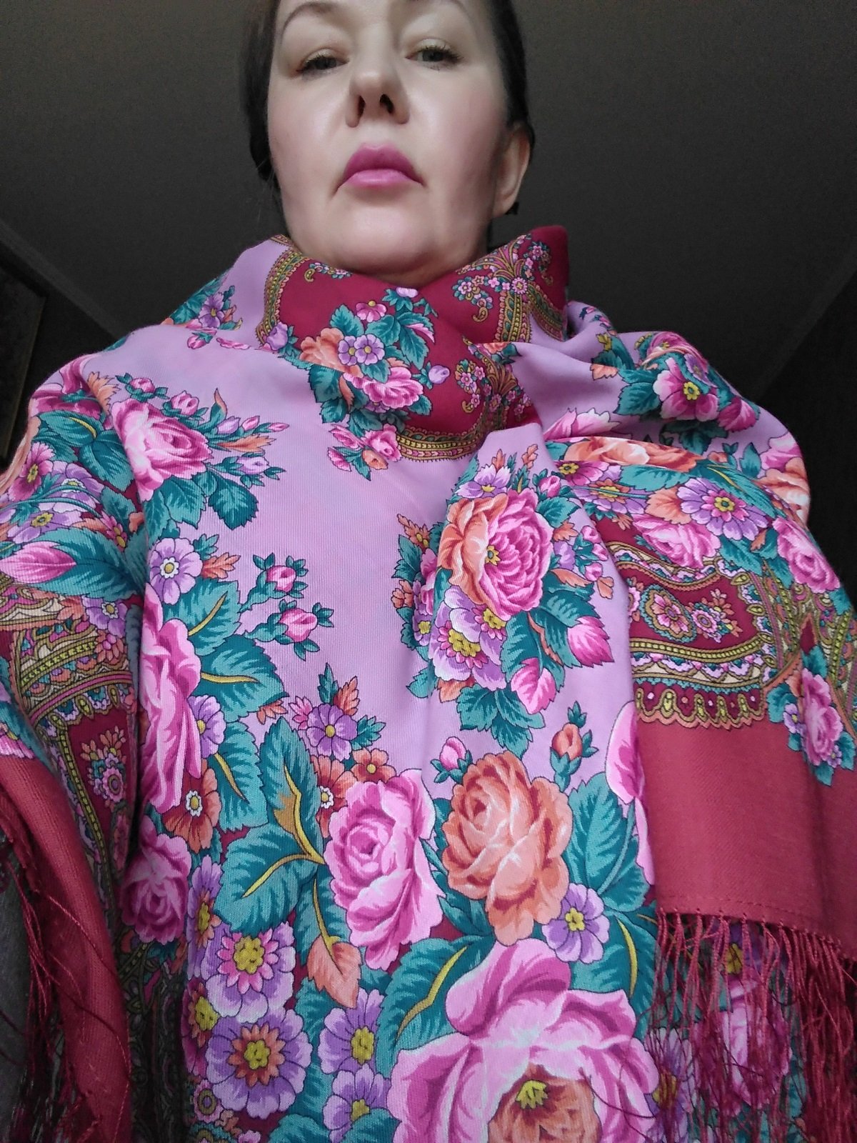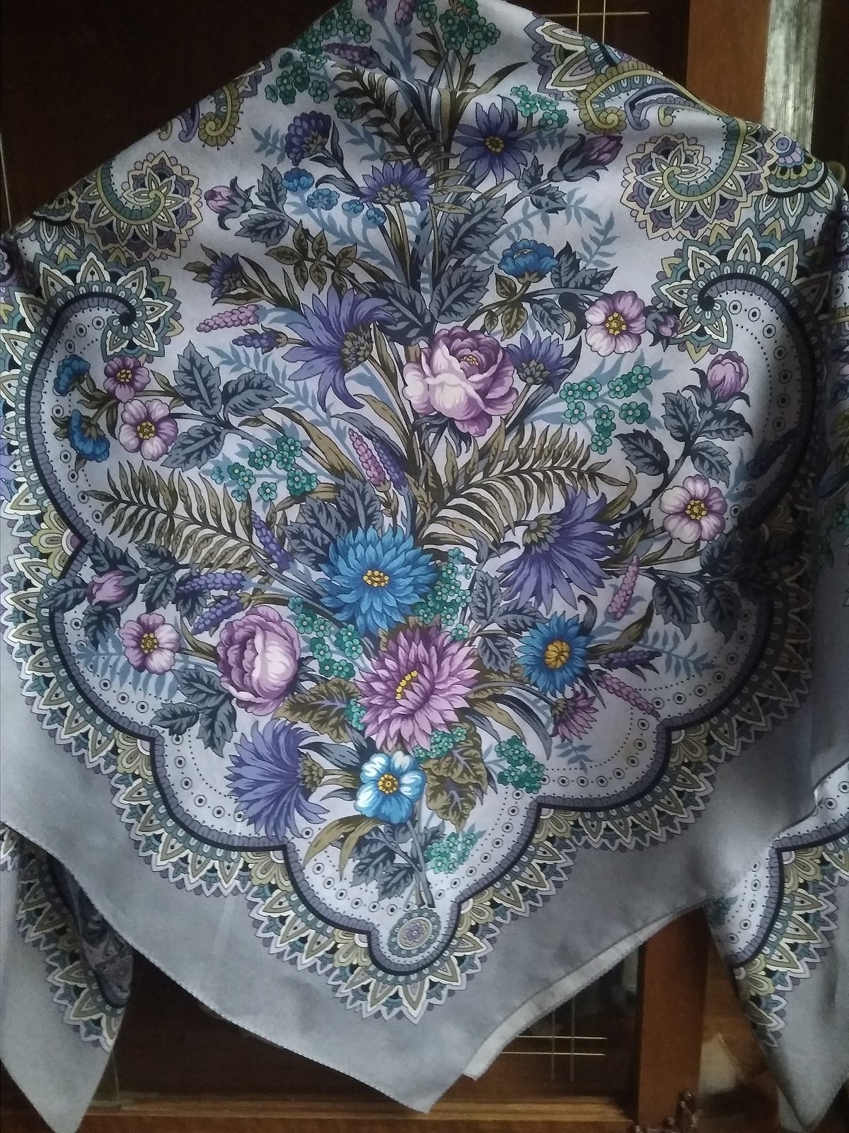 У меня на Восточных путешествиях навязана бахрома (кто о чем, а вшивый...), из-за этого платок как бы немного утяжеляется, выглядит солиднее и в практическом плане очень неплох на жару. Ну и совсем такие шейный малыши Татьянка, понятно что чисто для форсу. Вот такие среднеразмерные тоже купила в первый раз, и тоже в общем без особого энтузиазма, умом понимаю, что малоносибельный и не особо практичный в моем случае будет платок, но рисунок и цветовая гамма настолько хороши - в реальности смотрится как будто эти букеты как в цветном хрустале застыли, да стоил вроде не очень дорого, что не смогла устоять. За город куда поехать, может пригодится.