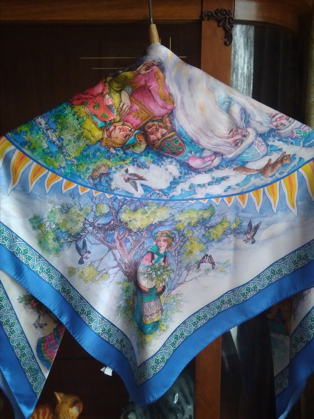 В архиве есть этот платочек на атласе, но там другие колориты. На жаккарде рисунок смотрится немного «туманно», контуры как будто слегка растворяются в утренней сумраке. Вообще жаккардовая ткань очень украшает платок, возможно на другом варианте был бы мною не замечен