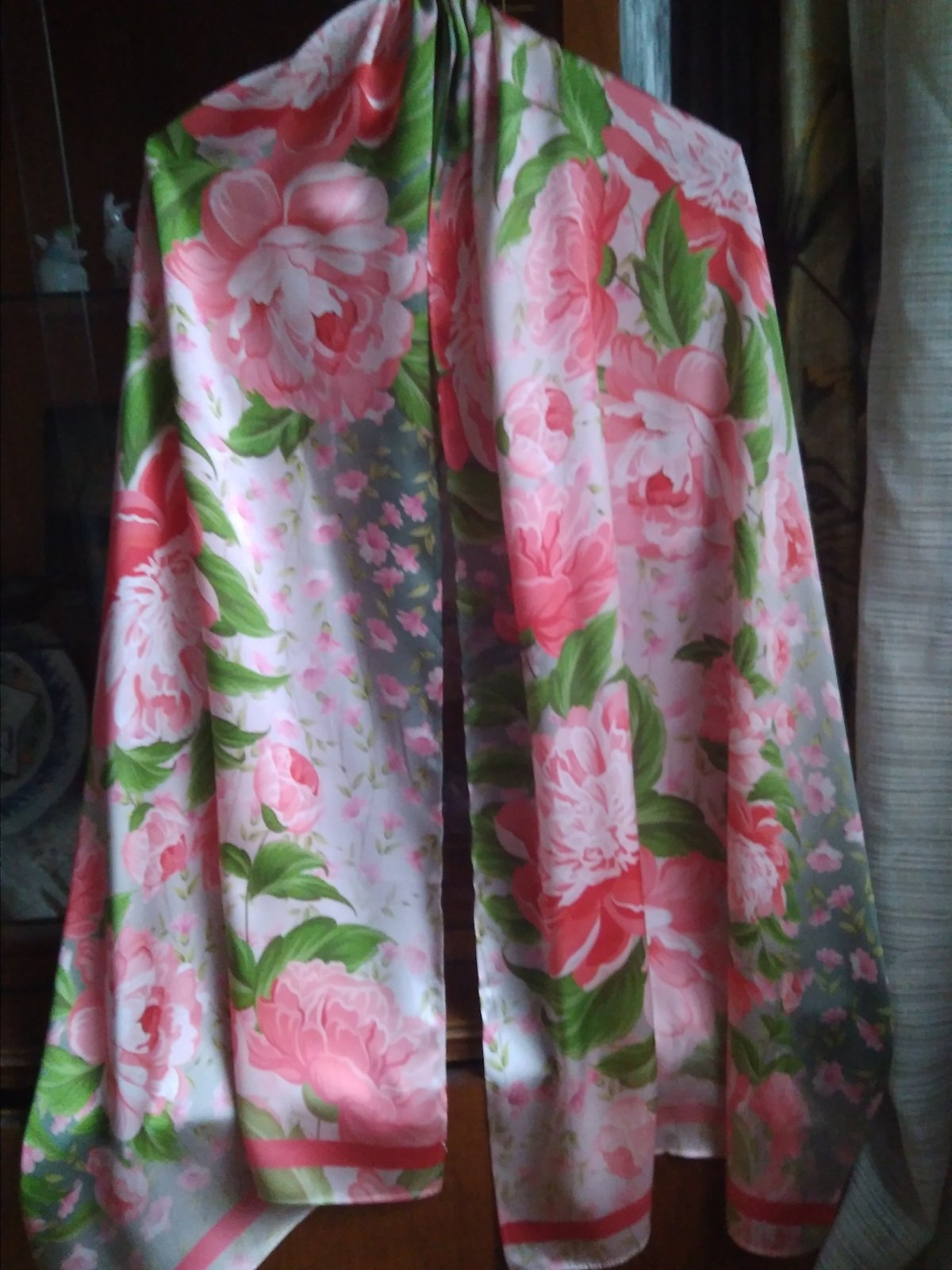 Я изделиями с рисунками Инны обычно не интересуюсь, да и шарфы особо не ношу, но вот этот шарфик привлек внимание своей необычной яркой и одновременно нежной весенней расцветкой. У меня этот рисунок пионов-лотосов в розовых-зеленых тонах ассоциируется с Китаем - китайской живописью, китайской вышивкой и т.д.. Композиция, довольно незатейлива, но за счет изысканного колорита очень украшает (что вообще в целом характерно для платков-шарфов авторства Макаганчук