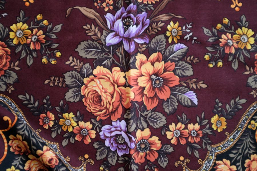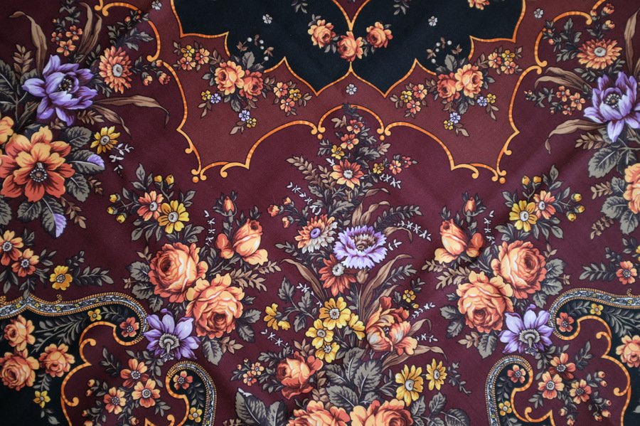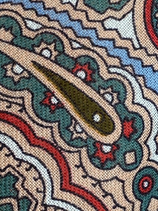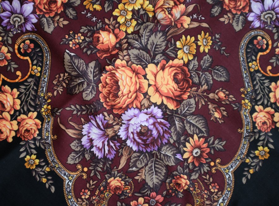 Кайма спокойно-синяя. Основные цвета -серо-голубой ( самый светлый), приглушенно-розовый -( на фото более бежевый) , бирюза разных тонов, желтый киви, темно-красный. Ничего зеленого, если не считать вкрапления болотно-коричневого. Основной тон платка сине-голубоватый.