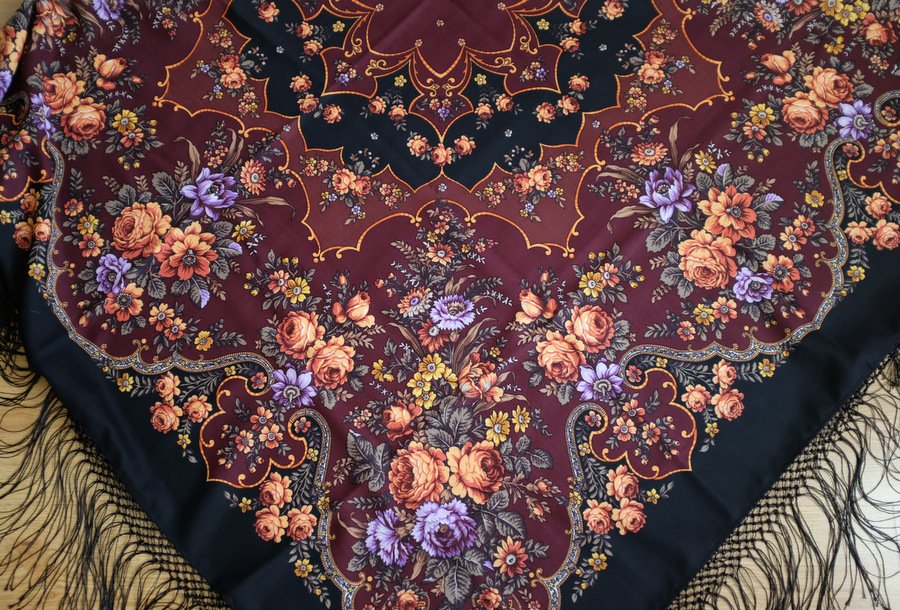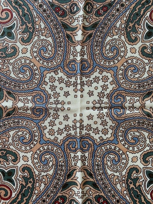 Кайма спокойно-синяя. Основные цвета -серо-голубой ( самый светлый), приглушенно-розовый -( на фото более бежевый) , бирюза разных тонов, желтый киви, темно-красный. Ничего зеленого, если не считать вкрапления болотно-коричневого. Основной тон платка сине-голубоватый.