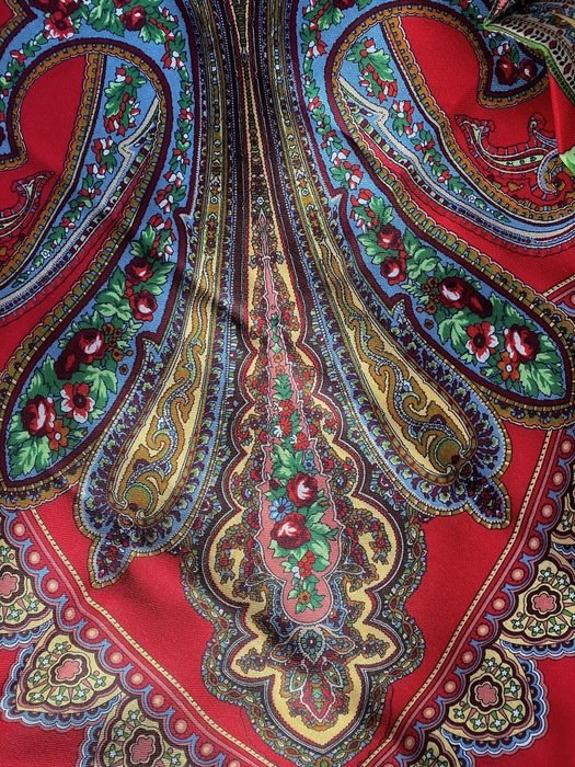 Платок красивейший не только своим рисунком, а главное цветом фона: не светлый, густой, классический красный, переливчатый, и ВНИМАНИЕ--меняющий оттенки! При разном освещении может быть очень разным!