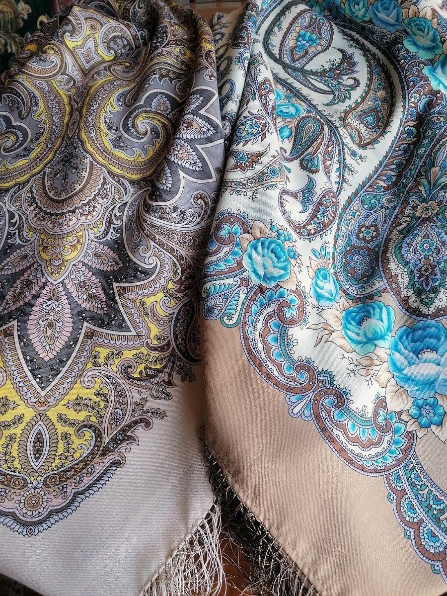 А у Валерии Фадеевой целая серия однотипных платков типа «Соловьиных ночей». Я их обожаю, шикарны на шее и плечах. Но на голове эти цветы суетливую рябь создают. У лица нет фонового обрамления.