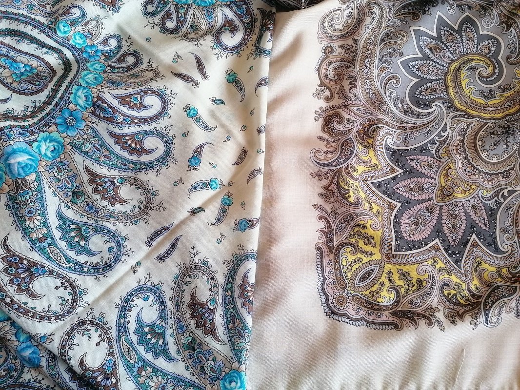 А у Валерии Фадеевой целая серия однотипных платков типа «Соловьиных ночей». Я их обожаю, шикарны на шее и плечах. Но на голове эти цветы суетливую рябь создают. У лица нет фонового обрамления.