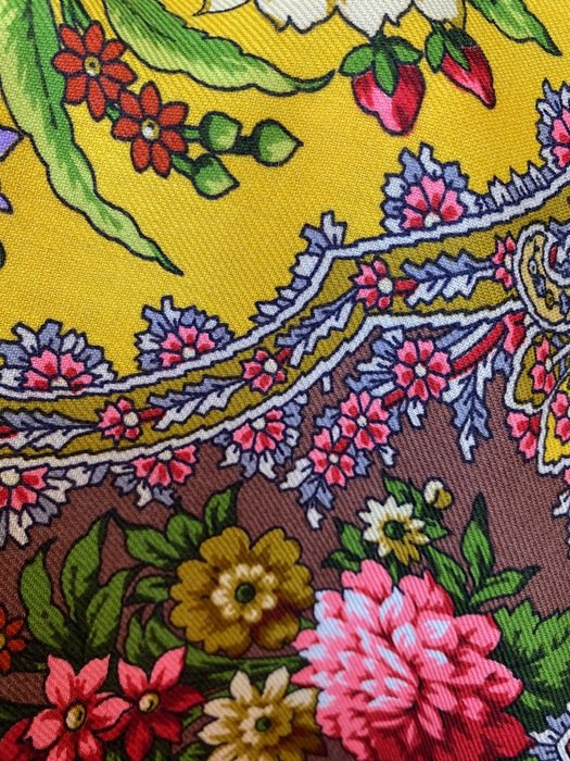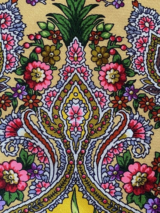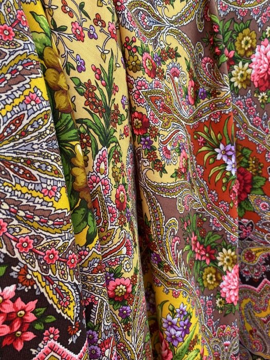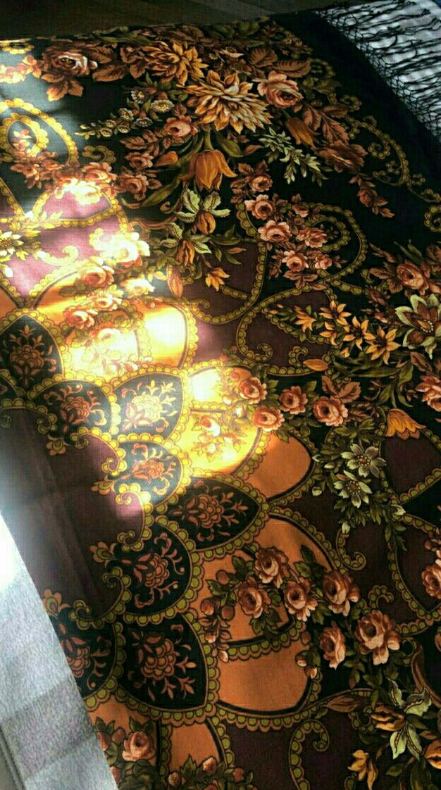 Яркий, контрастный, насыщенный, светящийся--это все о нем. Немного разный при разном освещении дневного света. Иногда выдает фломастерные нотки, особенно у цветков, как будто они подсвечиваются ( этот факт очень понравился). Самое красивое в нем --цветочные "капли" по кайме, очень заметные. Цвет каймы--горький шоколад, на солнце отливает светлым розово-коричневым, а в тени почти черно-коричневый. Оттенки желтого различные: бледная, зеленоватая охра (цвет зеленого золота);окошки--яркий желтый, что то между желтком и лимоном; зелень также яркая, не натурального оттенка, "теплая" ( с желтым) зеленка; другие окошки--темное, темное, сиреневое какао.