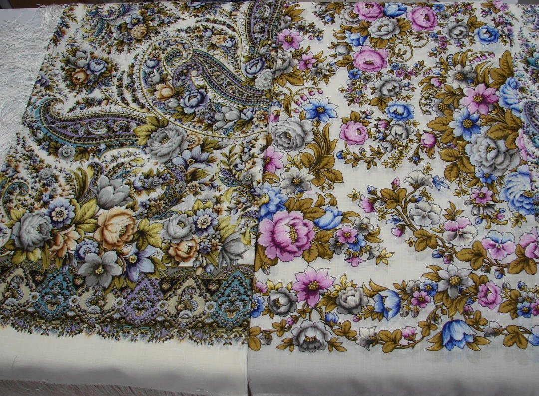 А так три платка Пава-2 и Утро туманное 3 и 4. Просили с 4-ым, но Пава настолько между ними... она взяла цвет роз и листики-хаки от 3-его Утра, но оттенки сиреневого от 4-ого.