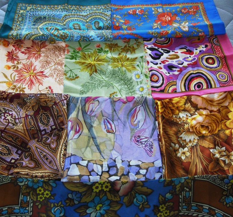 Разобралась со своими шёлковыми и батистовыми пп платками. Их не очень много, думаю, коллекция будет пополняться регулярно. Ещё очень много чего нравится из этой продукции. Хотелось бы голубое "Пламя свечи", красно-бардовую "Песню ветра", синюю "Восточную сказку", голубые "Сады Киото" и ещё каких-нибудь платочков красной и сине-голубой гаммы...