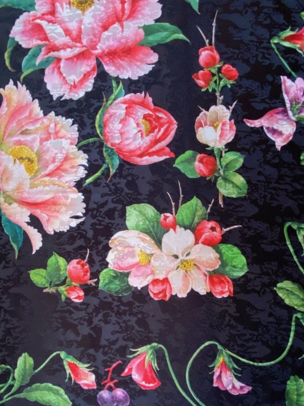 Нежный и романтичный, несмотря на черный фон. Хорошо, что он не атласный, жаккард его правильно припыляет и приглушает, как будто прохладным конденсатом. Помню ваш показ белого, на который я возлагала большие хотелки, но по вашим фото видно, что он лаймовый, что может быть совсем не показано к лицу.