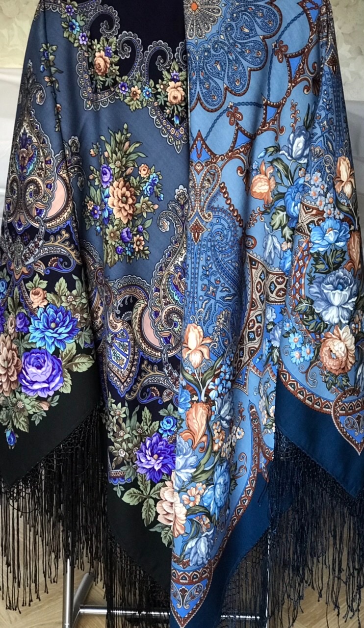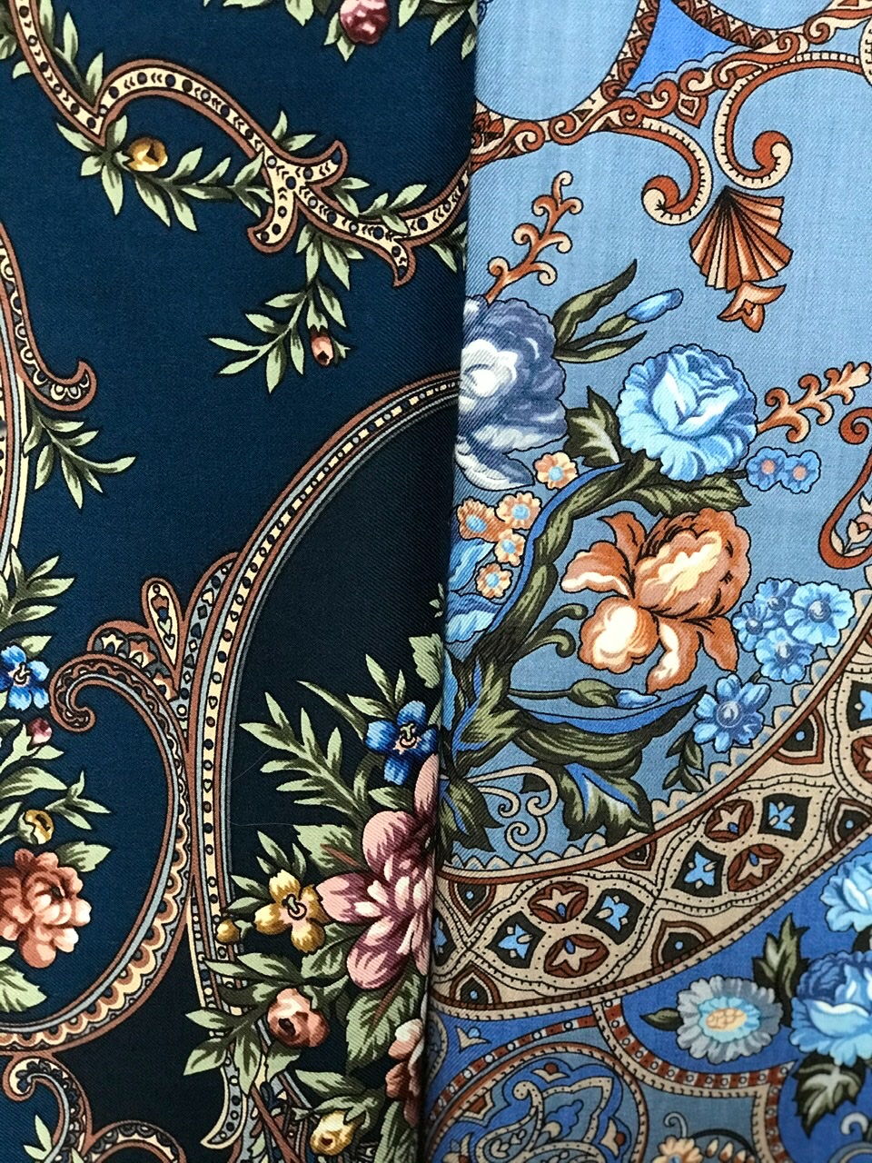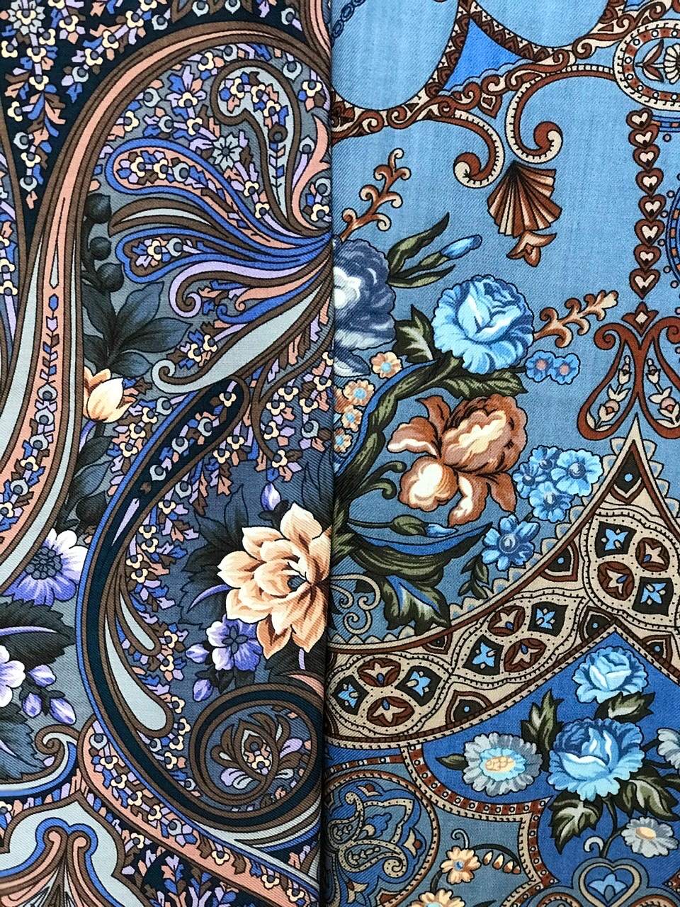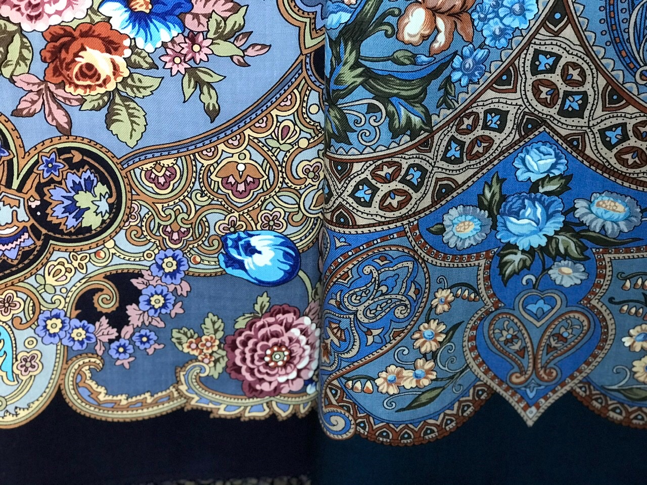 Голубой в Княжеском разных оттенков денима, т.е. присутствует некая разбелённость, ясный темно-голубой присутствует в элементах рисунка: маленьких медальонах по кайме, в маленьких треугольничках в среднике, в ажурной вязи.
