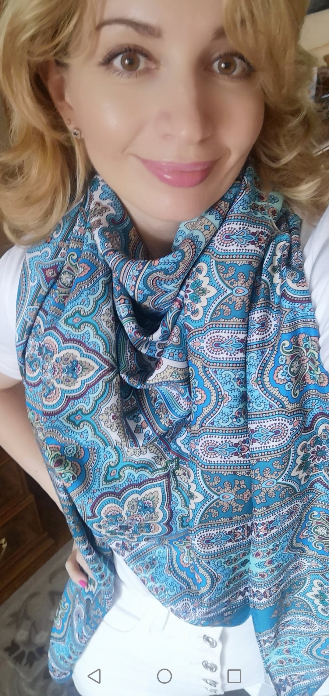 А я не могла не забежать и не показать свой первый вискозный платок) Пока только селфи на скорую руку (прям из пакета, даже ещё не погладила, прошу прощения). Но обязательно потом пофотографирую, т.к. в архиве этого колорита нет, а платочек понравился очень. Любимая бирюза! И качество печати, и ткань порадовали. В свое время заказывала красную Фергану на вб, так не взяла, каким-то он совсем показался тоюсеньким и не ярким. Может ещё и от того, что пришёл весь мятый и скомканный, как на вб бывает. Но с Ферганой 11 все сложилось :@