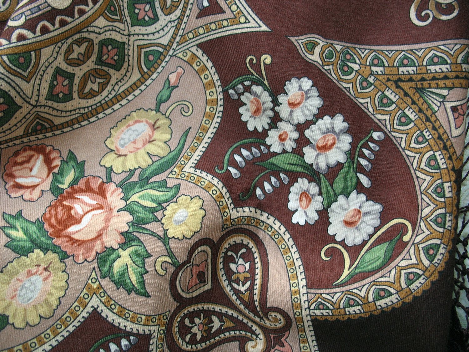 Зелёный совсем не яркий. Возможно камера чуть усилила зелень, но если только чуть. Мне нравиться, она оживляет, без неё было бы блекло на мой взгляд. Всё цвета смотрятся очень гармонично. Кстати, серые цветы вовсе не серые, серо-сиреневые(или лиловые? ) очень сложный цвет, камера не передала его. Мне эта шаль очень понравилась. Спокойная, элегантная, шоколадная) .