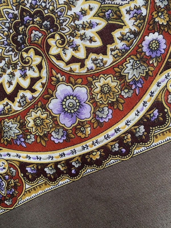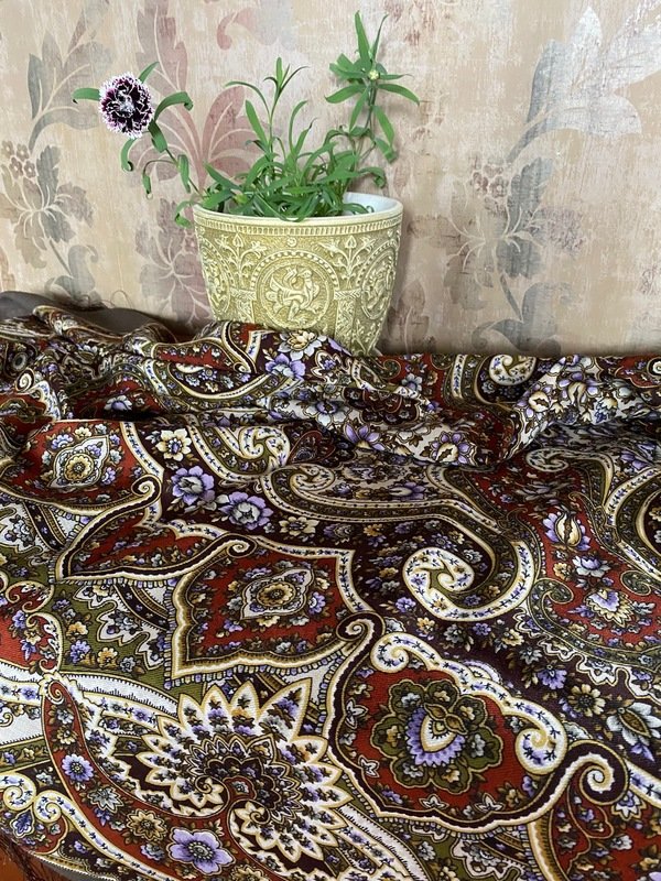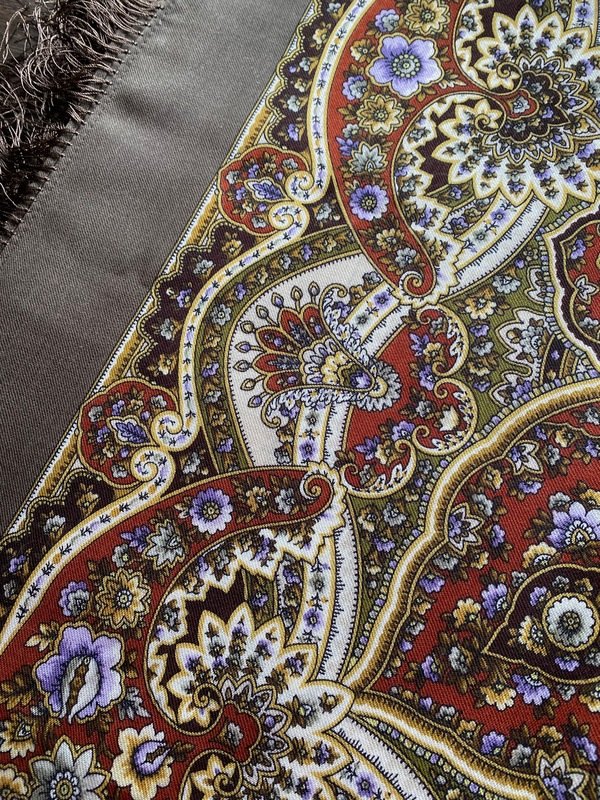 Кайма теплой , зелено-серой оливки, только на фото упорно уходит в серый. Верный цвет каймы получается редко-- при сильном приближении камеры. Оттенки коричневого действительно медовые: красноватые, темно-коричневый (гречишный мед), (Кликните, чтобы почитать оффтопик)... желтые, охристые. Кирпичного цвета нет. Назвала бы --красно-коричневый, оттенок темной меди ,ржавый ( на фото он немного светлее) . Цвета сочные, но на фото платок ярче. Зелень густо травяная, насыщенная. Самый светлый цвет фона, в отличие от фото, где он кажется льняным ^! , на самом деле тепловатый, ванильно -масляный с едва зеленцой, очень светлый.