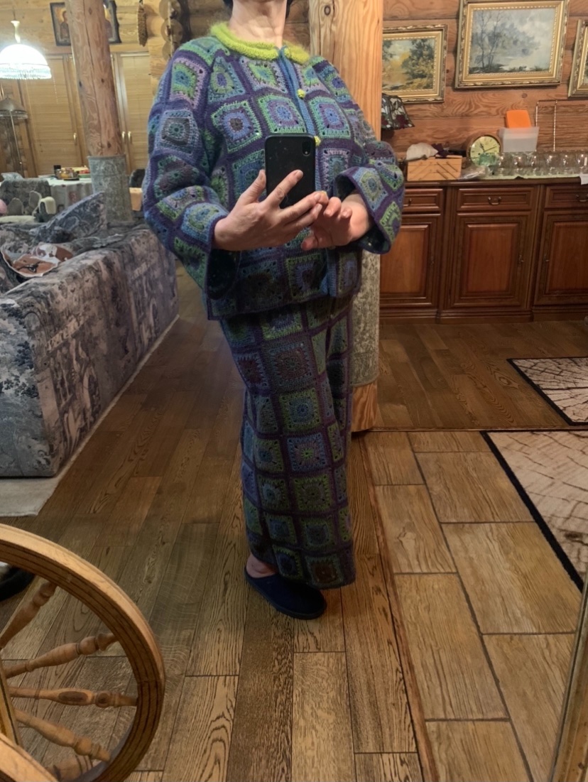 Очень крутой наряд.. с тапками для дома, с лодочками в любое светское общество, с кроссовками для прогулок!Наконец-то, я закончила вязать домашний брючный костюм. Уютненько.