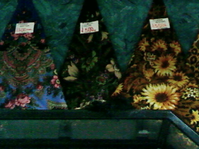 сегодня увидела вот такой платок.Он посередине. На ценнике написан размер 150*150, шелковая простая бахрома. Может, кто узнает? Простите за фото,платок висит в магазине под самым потолком, фотографировала на поднятой вверх руке. Видела и ВУ но синий, бахрома вся распушена на кончиках.......