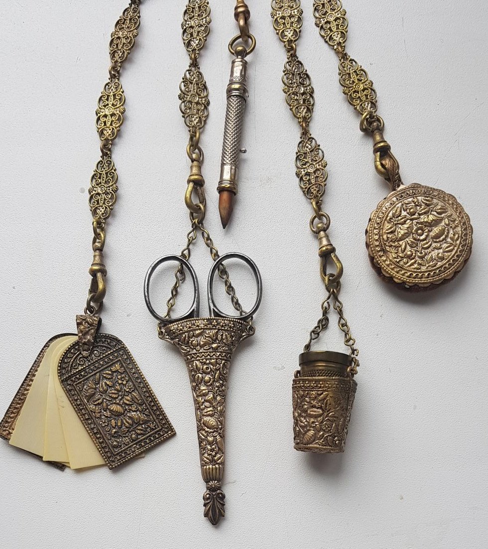 Шатлены более известны как аксессуар к часам. Их чаще носили мужчины. Помните, к примеру, картины Кустодиева ? Там часто изображались купцы, а на животе цепочка с часами. Шатлены, для женщин, использовались очень давно, но менее известны. Их делали на разный вкус и кошелёк. Встречаются из простых металлов, но есть серебряные и золотые. С разными подвесками, но чаще: ножницы, наперсток, измерительная лента, карандаш и карне. В музеях они представлены, как произведение искусства.