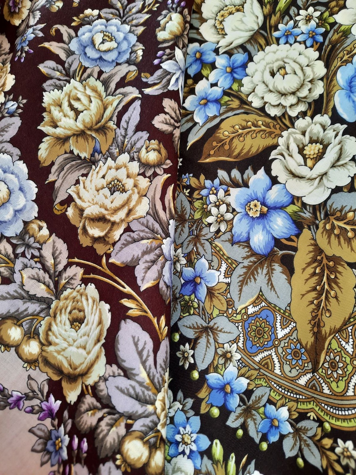Кайма и основной фон более холодного оттенка у нового, а окраска лент- теплее.