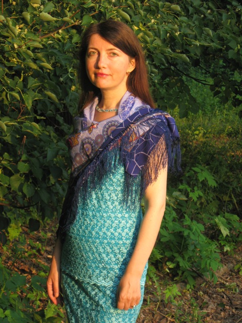 Демонстрация SLana "Старого замка" сподвигла меня на отважный поступок. Несмотря на жару я обновила синенький "Трубадур". Надеть синее шерстяное платье и туфли на каблуке я не смогла (лето, жара :" ), костюм, что на мне к платку не подходит, но зато бирюзовый, как раз для клуба. "Трубадур" напоминает мне о любимой Франции, витражах готических храмов, замках. Передать на фото колорит "Трубадура" сложно, т.к. солнышко вмешивается. Пожалуй, ближе всего к истине среднее фото.