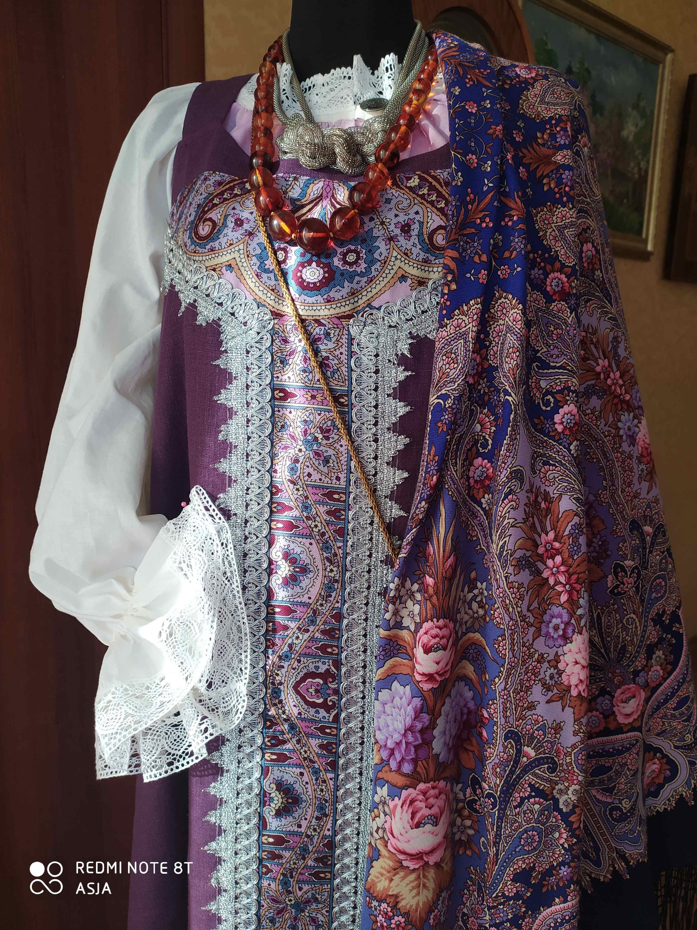Этот же сарафан,в итоге,остался в комбинации с другой шалью. Душегрея надета только дома,дамы до нее пока не дозрели. Хотя мне кажется,что она очень повышает градус,пардон), аутентичности. Как думаете?