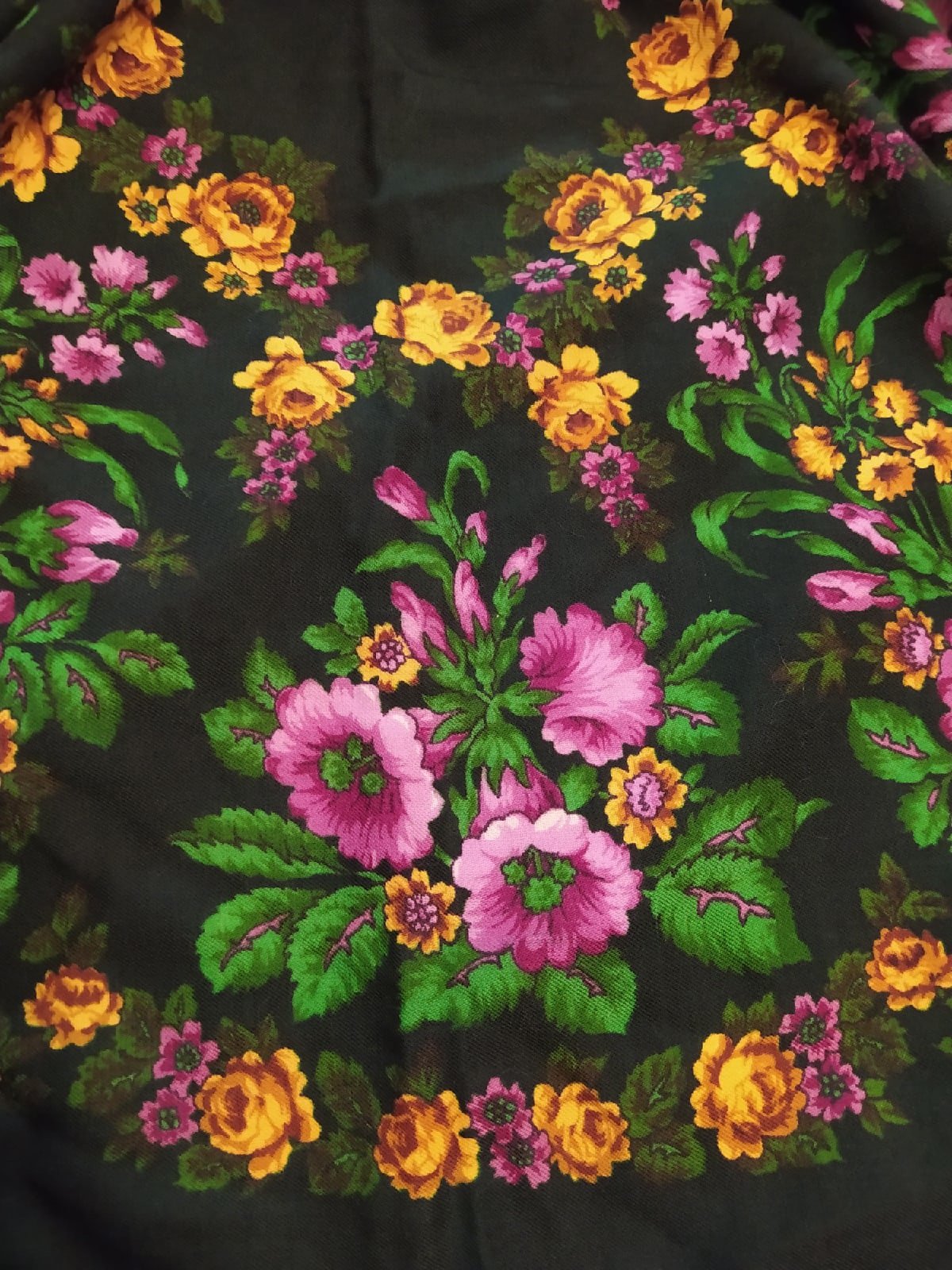 Возможно колорит 1.0 - кремовый с желтой обводкой. Дело в том, что на уже моем платке есть черный контур - очень тонкий, но есть. Ручная набойка - есть точки, мягонькая и пушистенькая. Тепленькая.