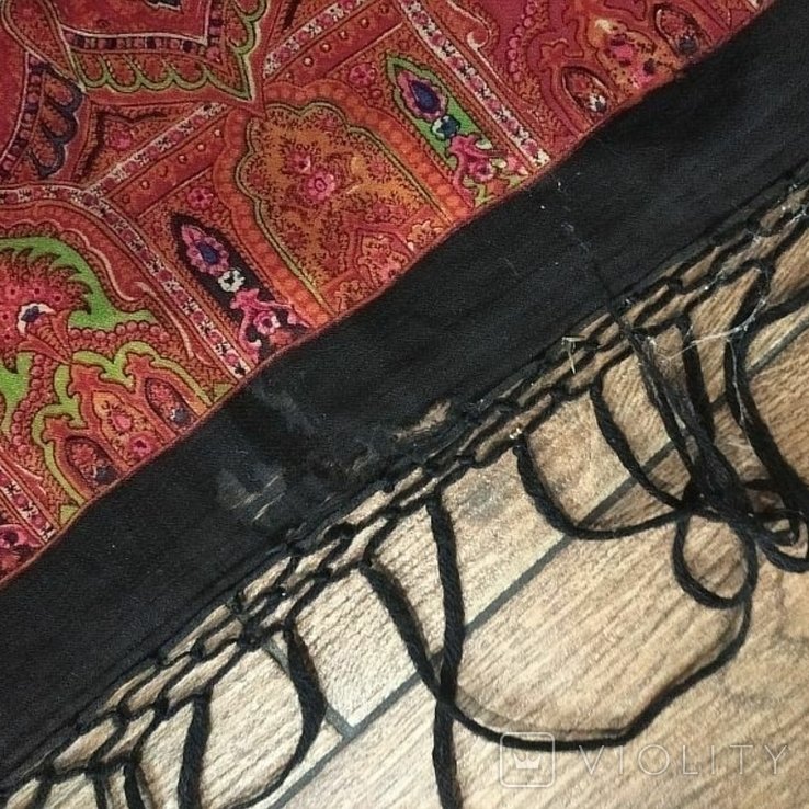 Белой шерсти с набивным красным, синим, голубым, зеленым, сиреневым, малиновым узором. По полю ветки с одиночными розами, расположенные в шахматном порядке. По кайме в углах букеты из роз, бутонов, ветки с мелкими колокольчиками. От букетов в стороны отходят стелющиеся стебли с розами, чередующихся по цвету. Бахрома белой шерсти.