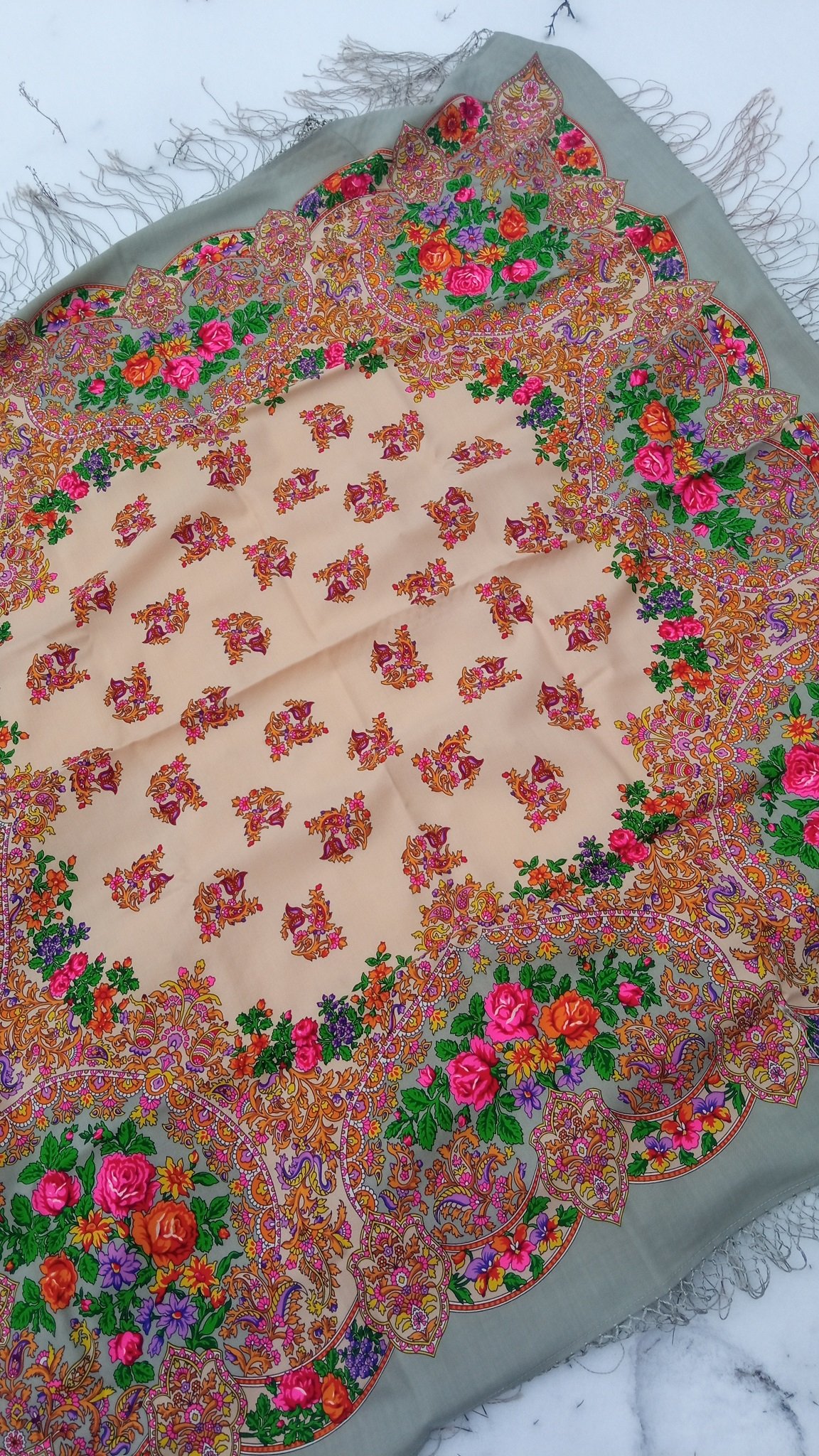 Mariko, очень рада за Вас! И очень рада, что Вы снова с нами. Мне тоже повезло купить такую Чеканку. Это у меня единственная шаль ручной набойки. Как-то был очень удачный год, когда я купила довольно редкий платок Рыжова, Воспоминания, Золотистые розы Регуновой. И почти все с минимальным покусом моли, :) А Чеканка вообще идеальная. А вот серая, белая, красная, без бахромы, у меня не прижились.