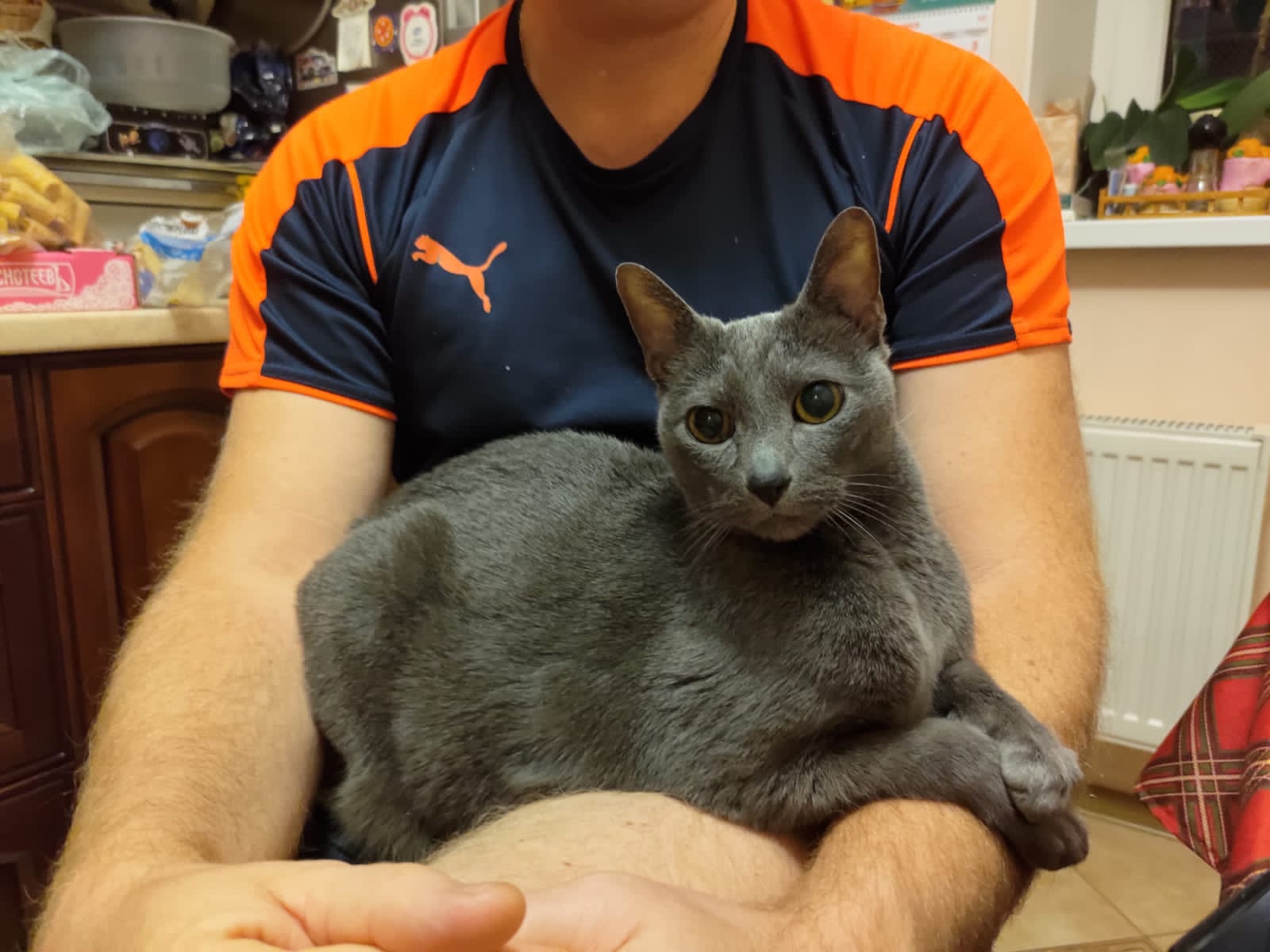 А передние лапки любит класть на руку. Вот фотографироваться совсем не любит, редкий случай, когда удалось. Нежный, деликатный, интеллигентный котик, и с ним всегда можно поговорить