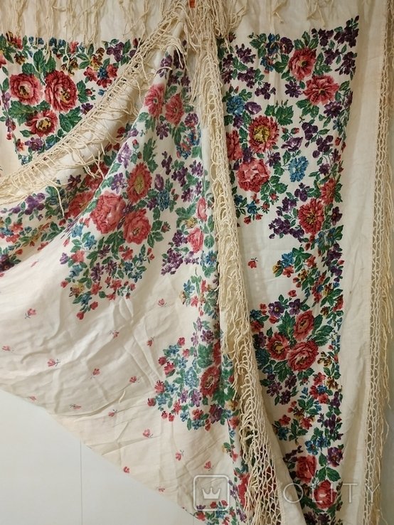Белой шерсти с набивным красным, синим, голубым, зеленым, сиреневым, малиновым узором. По полю ветки с одиночными розами, расположенные в шахматном порядке. По кайме в углах букеты из роз, бутонов, ветки с мелкими колокольчиками. От букетов в стороны отходят стелющиеся стебли с розами, чередующихся по цвету. Бахрома белой шерсти.