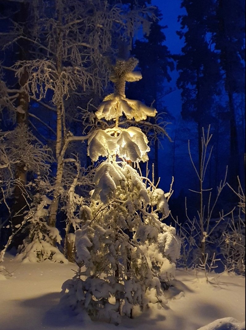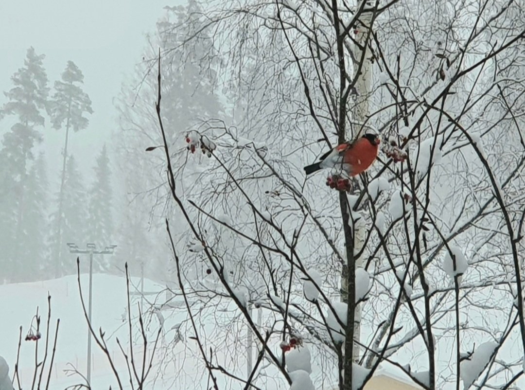 Как хорошо заметен красный платок в белом зимнем лесу! Никто не потеряется!