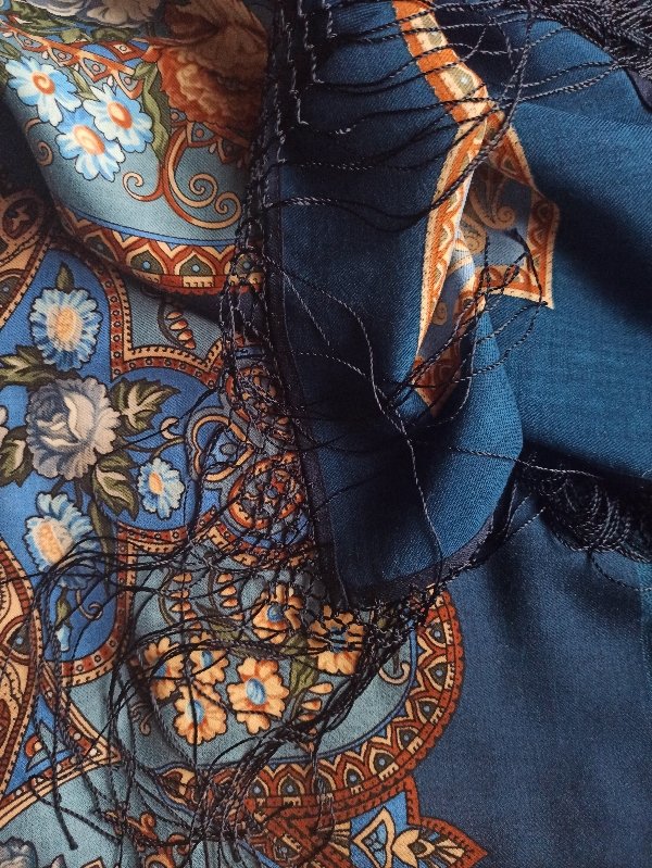 На фото откуда-то появился зеленоватый оттенок, его там нет, ну или почти нет. Основные голубые оттенки на обоих платках, практически, идентичны, разница, кмк, обусловлена качеством ткани. На новом платке ткань шелковистая, на старом - шершавая. За счёт толстого контура старый платок контрастнее там, где цвета одинаковые, но есть и действительные отличия по контрастности, например, в исполнении цветочков, новые немного смазаны. Светлый коричневый цвет на новом немного теплее, зелёный тоже, но в целом платки выглядят одинаковыми.