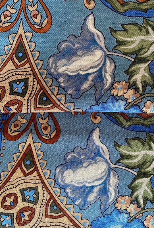 А вот , с голубыми и "глиняными" цветами --наоборот. У летней версии они темнее, а у октябрьской--светлее. Речь идет о крупных цветках. В остальном орнаменте нет никакой разницы в оттенках.