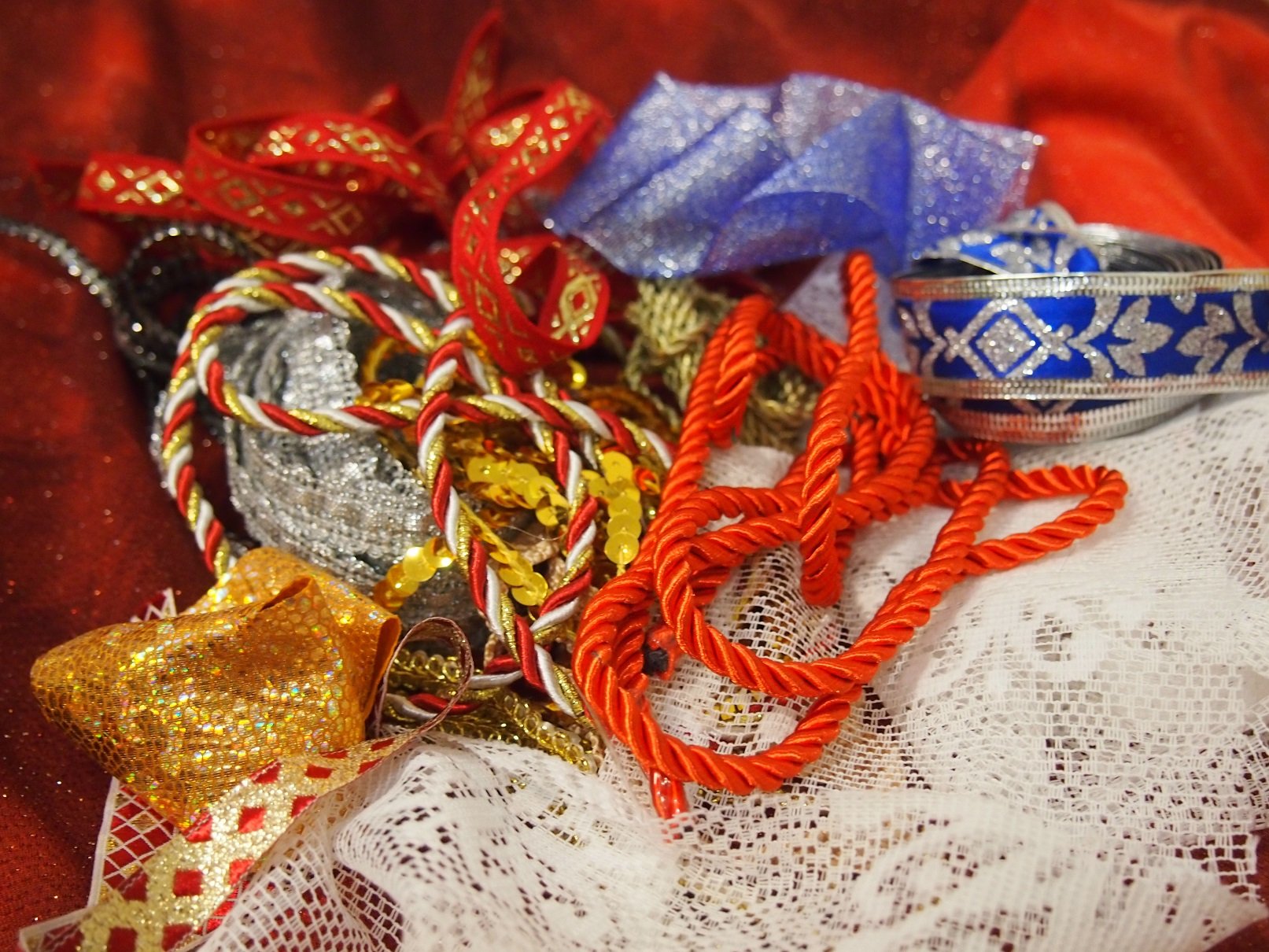 Если у вас, как и у меня хранятся разные ленточки от подарков-тортиков, остатки тесемок, кружева, блестящие лоскуточки, поломанные брошки, рассыпанные бусы,