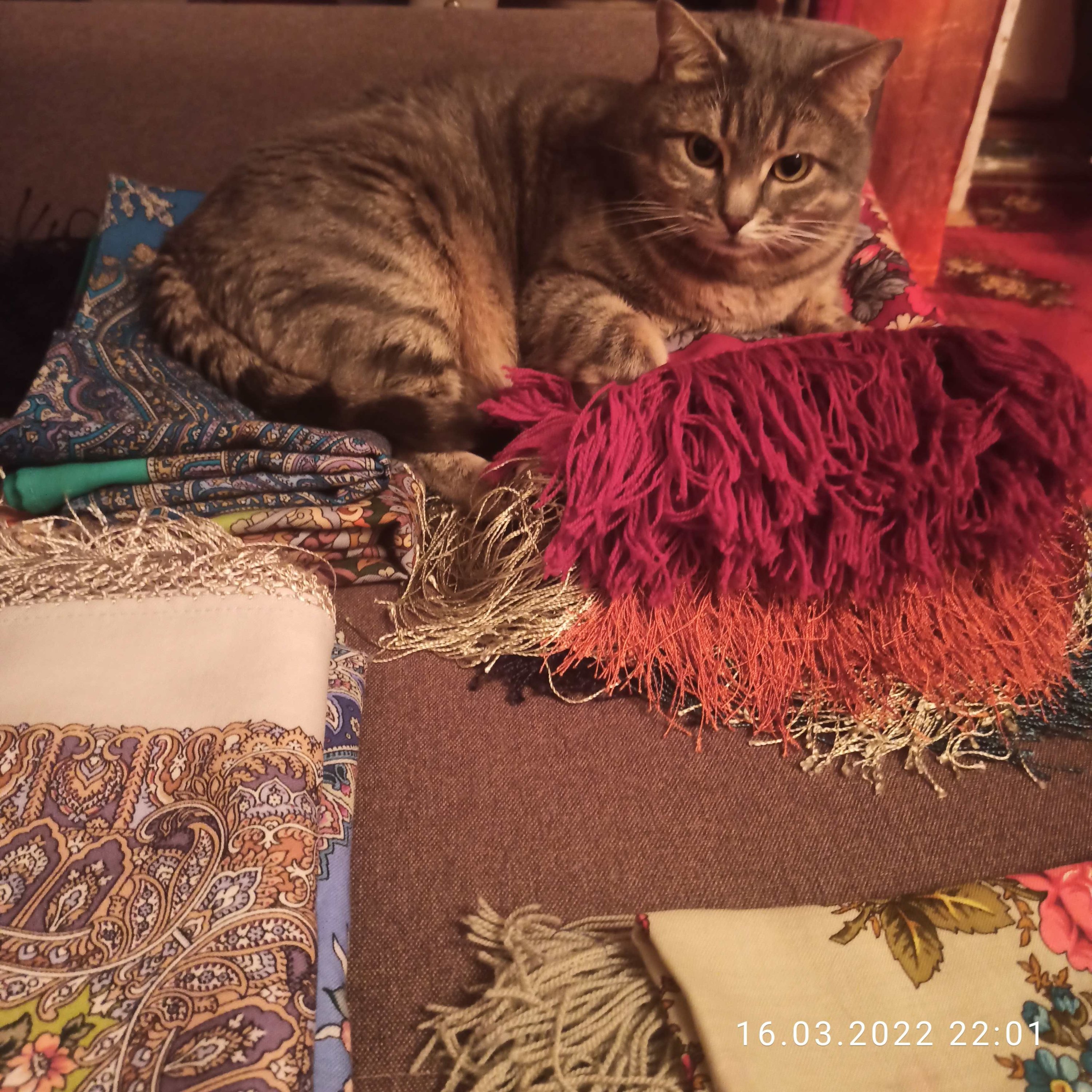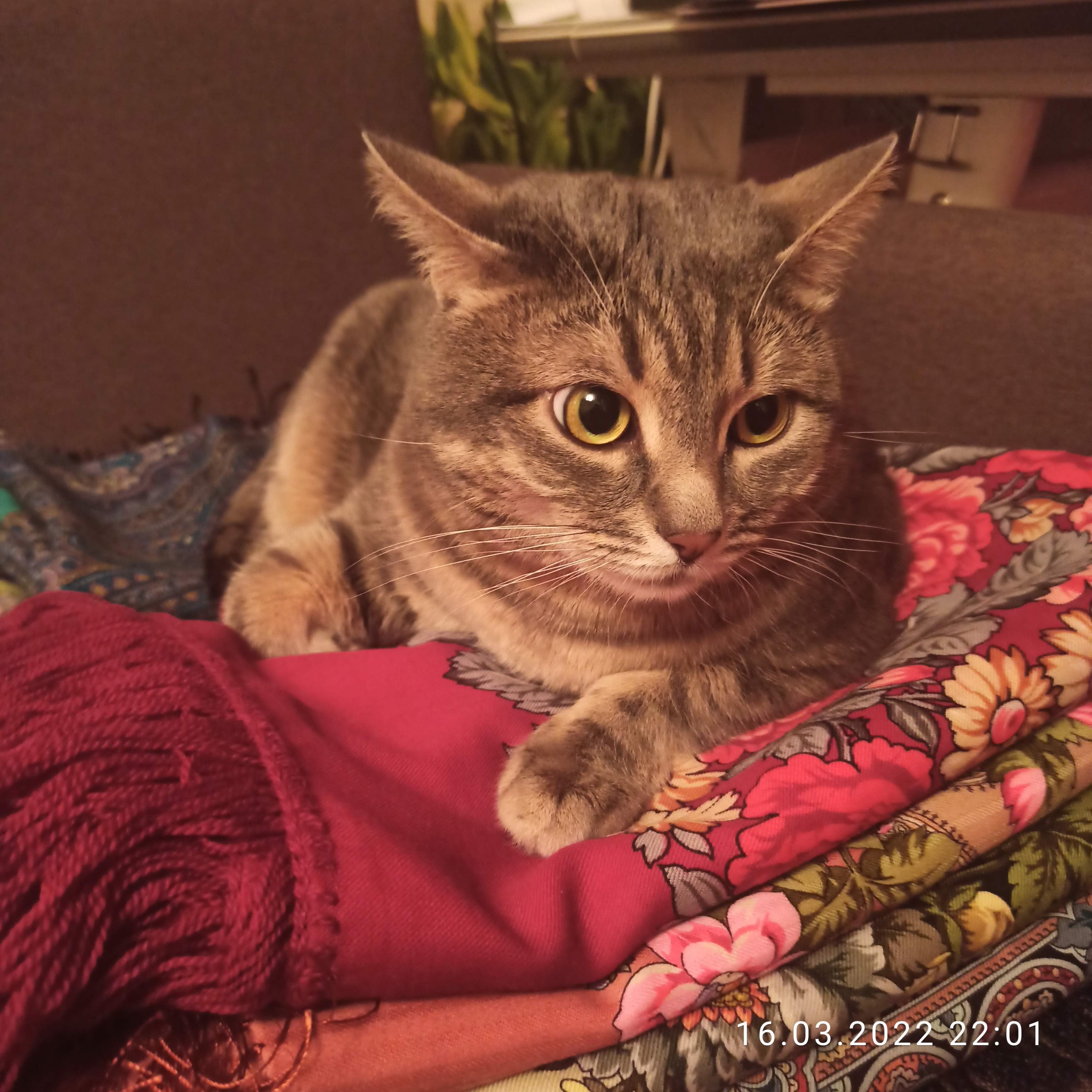 На днях "помогал" сортировать платки к весне. При по попытке прогнать с платочной стопки- кусался. Пришлось фотографировать ><