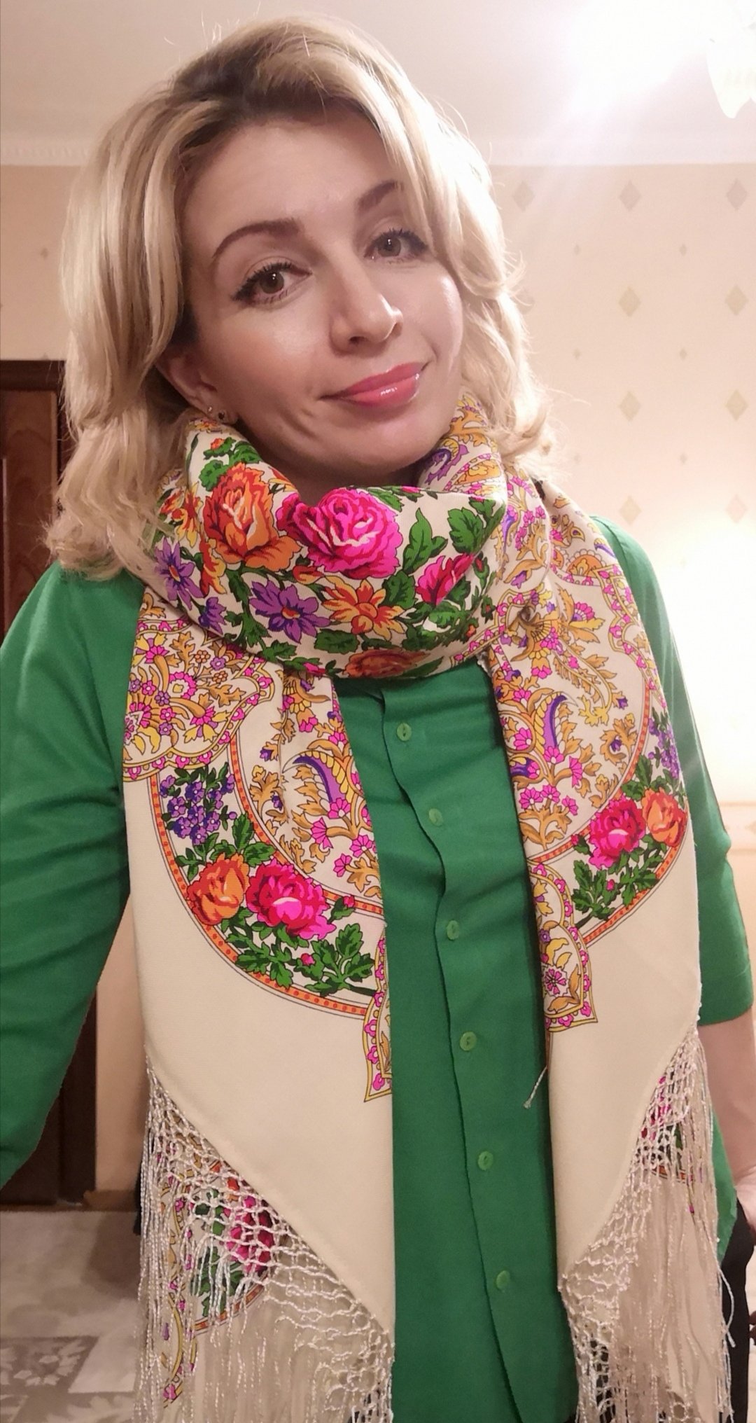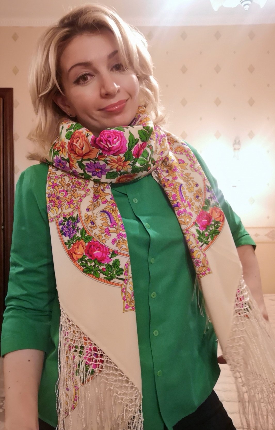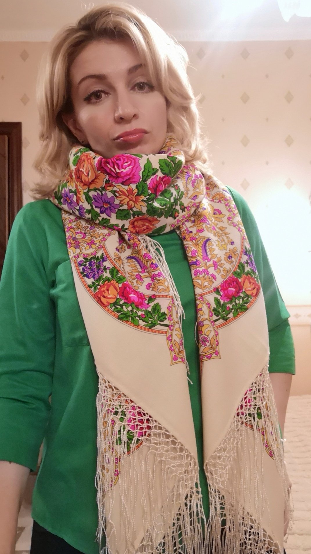 Да, она при дневном свете не слишком отличается, а в свете лампочки - прям очень. Я решила шаль носить как есть сколько получится. Бахрому снять никогда не поздно, она обтреплется, а еще ведь светлый платок придется стирать... тут бахроме и конец.