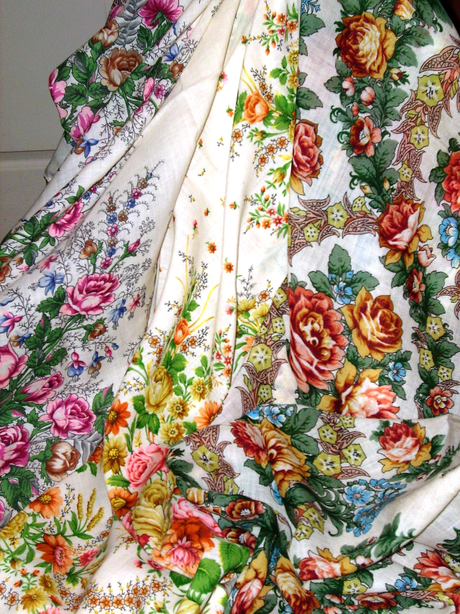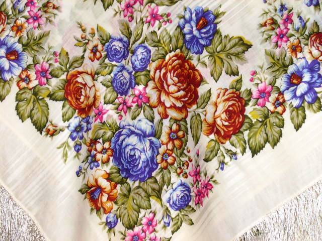"Розы на снегу", "Отрада" с бурыми фестонами, а также поплиновая шаль 70-х гг. прошлого века (т.н. павловопосадский хлопок).