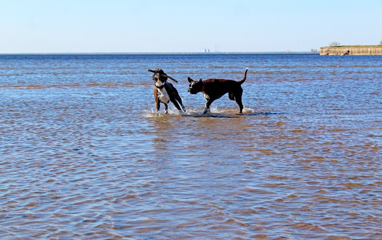 Собаки радуются жизни, беззаботно играют друг с другом.