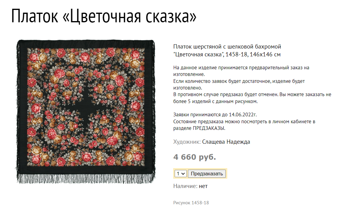 18-я Цв сказка мне давно нравится, вроде бы, надо брать по предзаказу. Но и 30-я мне нравится. Самое обидное, что 30-ю я покупала для нашей форумчанки, последние в Москве экземпляры, и там в магазине был еще один платок. Могла бы купить и себе тоже по той еще цене (там по-моему, еще и скидка была) Себе не купила. А теперь-то в два раза дороже! Но, 30-я Цв сказка очень нравится. Подписалась, короче на обе и на 18 и на 30. Была не была! А может 18-ю вычеркнуть, пока не поздно? Она скучновата вроде. Нет? А если еще и 7-ю предложат???? Ой, не могу! Очень дорого.