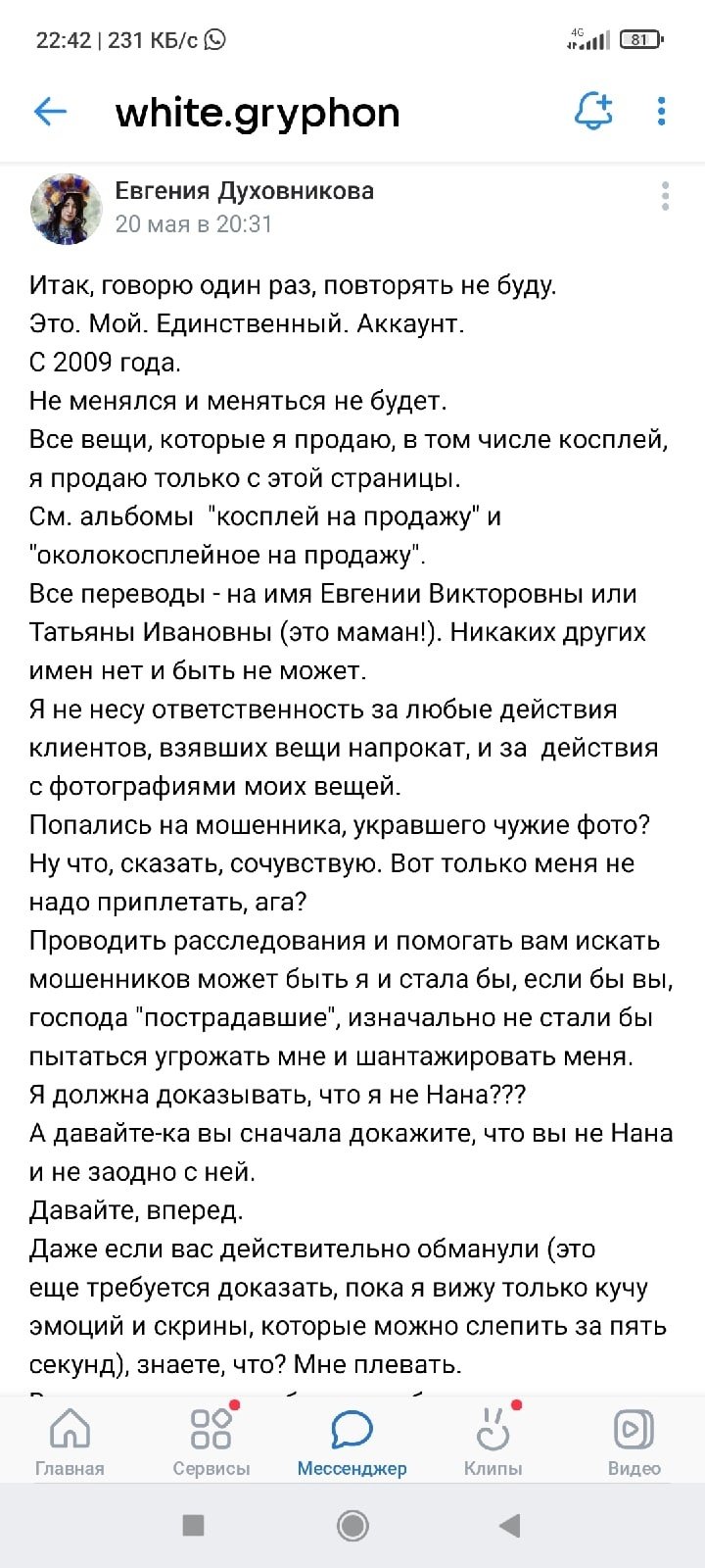 Ну и вишенка на торте. Сегодня Оксана Ильюшенкова сказала, что это действует Евгения Духовникова (Евгения Викторовна Д., про перевод на имя которой я упоминала выше), на реальной странице Евгении в вк есть упоминание о ее маме Татьяне Ивановне, а первое упоминание о Духовниковой Татьяне - мошеннице есть прямо на первой странице Черного списка в официальной группе, писали о них Аня Лаврова и Елена Андреева еще в 2017 году как о прожженных аферистках! Потом еще в 2019 пострадали Вера Гришкевич и Оксана Ильюшенкова (стр. 13).