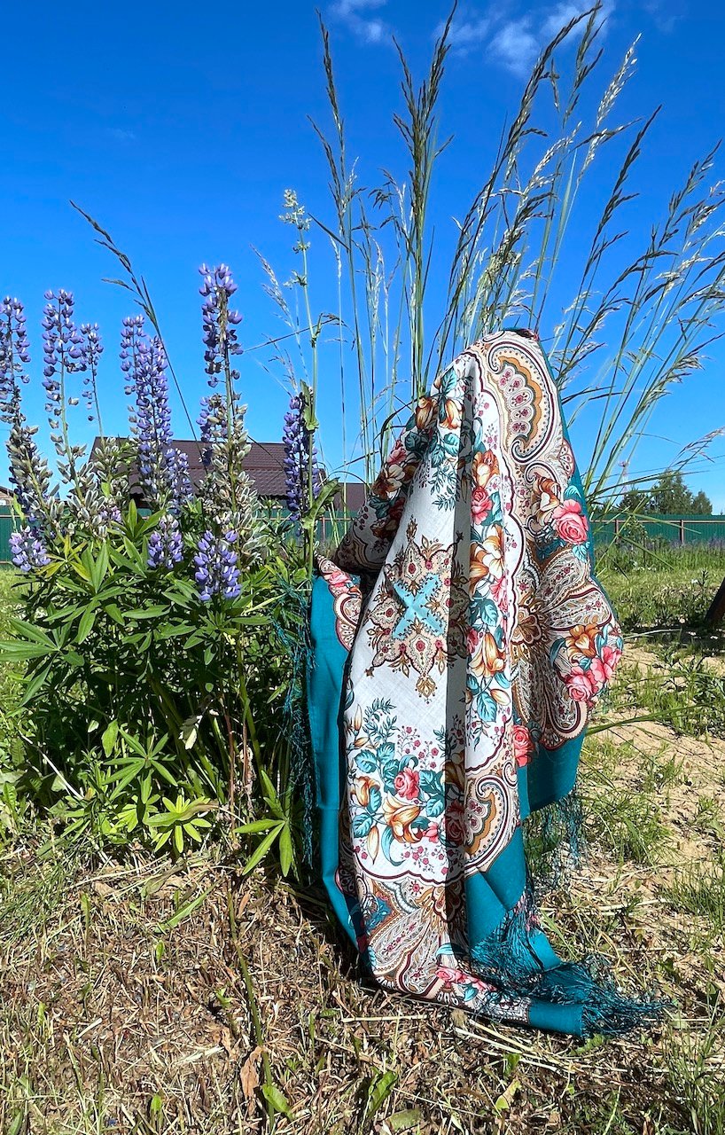 Собрала третий интересный мне колорит среди размера 89. Третий платок где цвет каймы не то морской волны (она всякая бывает), не то загадочной бирюзы горного озера. Первые два это Камаринская 12 и Воздушное настроение 12. Теперь к ним прибился Русский Перепляс 11.