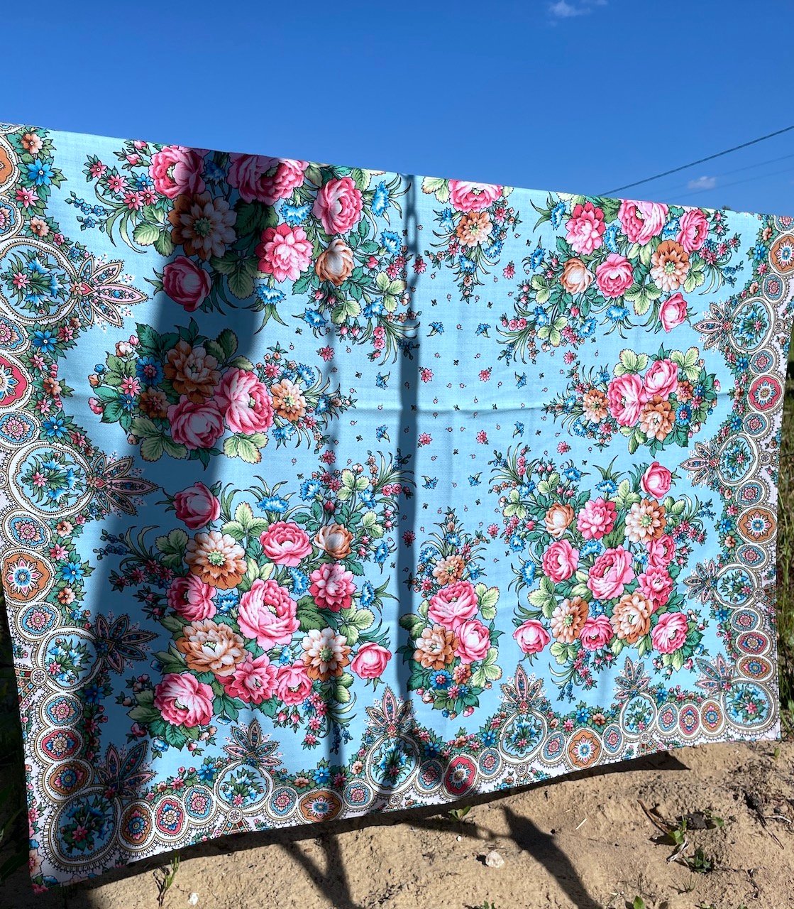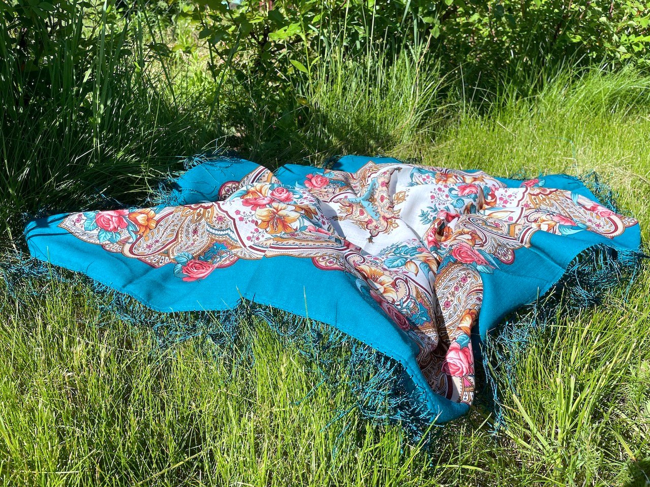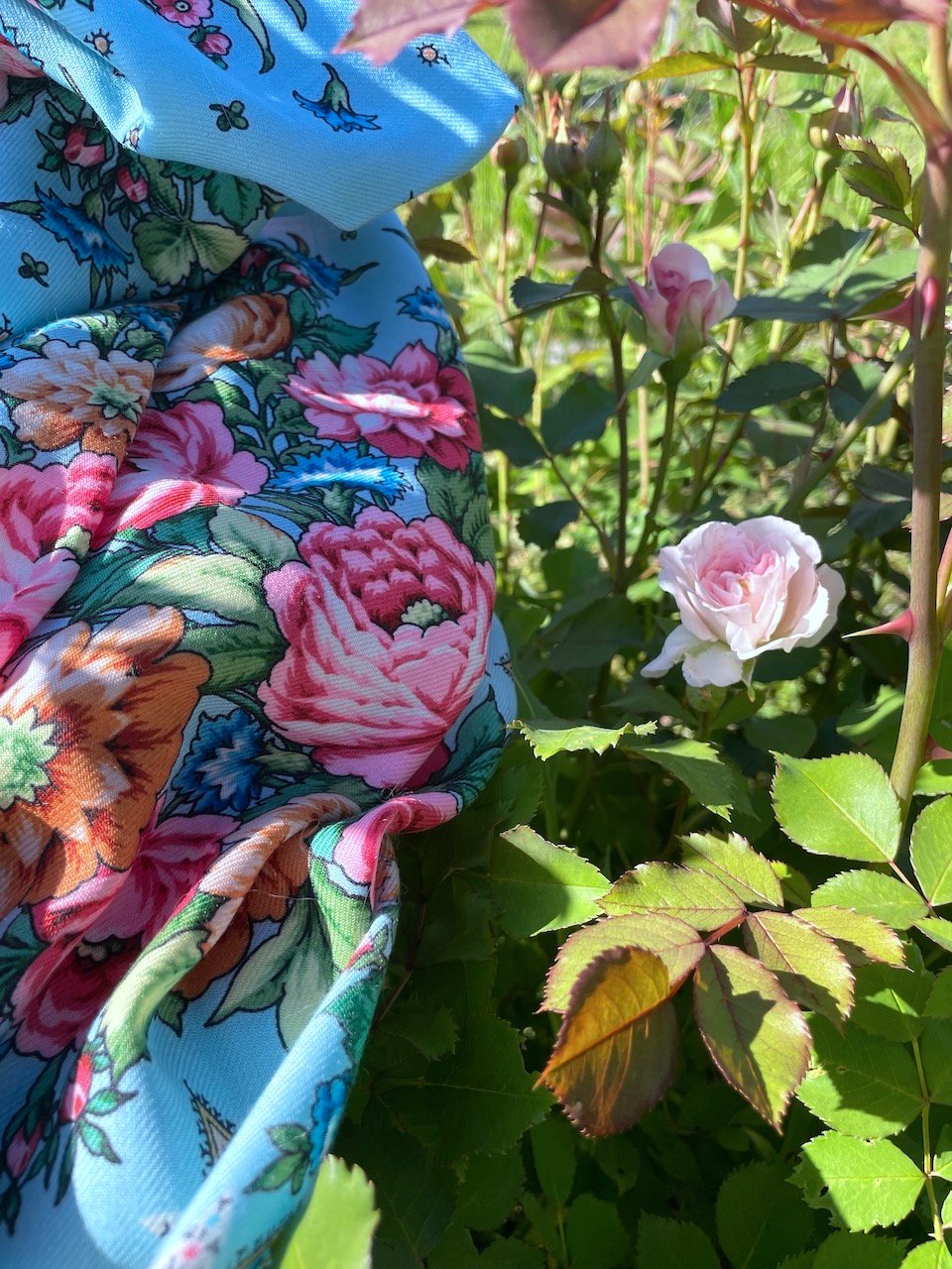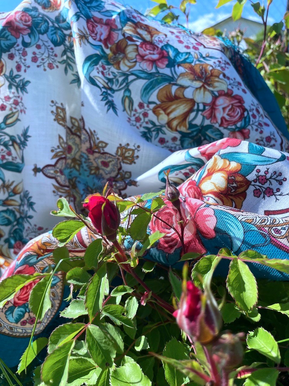Будет позже сравнение всех трёх платков. А пока покажу РП на солнце, он удачно со мной выбрался на фазенду, где распускаются мои прекрасные розы. U^U