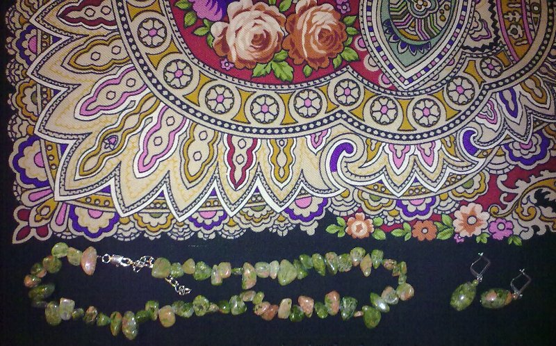 Сегодня мне привезли вот такие бусы, рекорд (для меня) по количеству разных материалов: кошачий глаз, бирюза, змеевик, муранское стекло, малахит, амазонит, яшма, натуральный жемчуг, стеклянные бусины, бисер (информация с сайта магазина). Бусы не пожелали сочетаться ни с одним из шерстяных платков, и тогда я вспомнила про шелк; "Отражение Юноны".