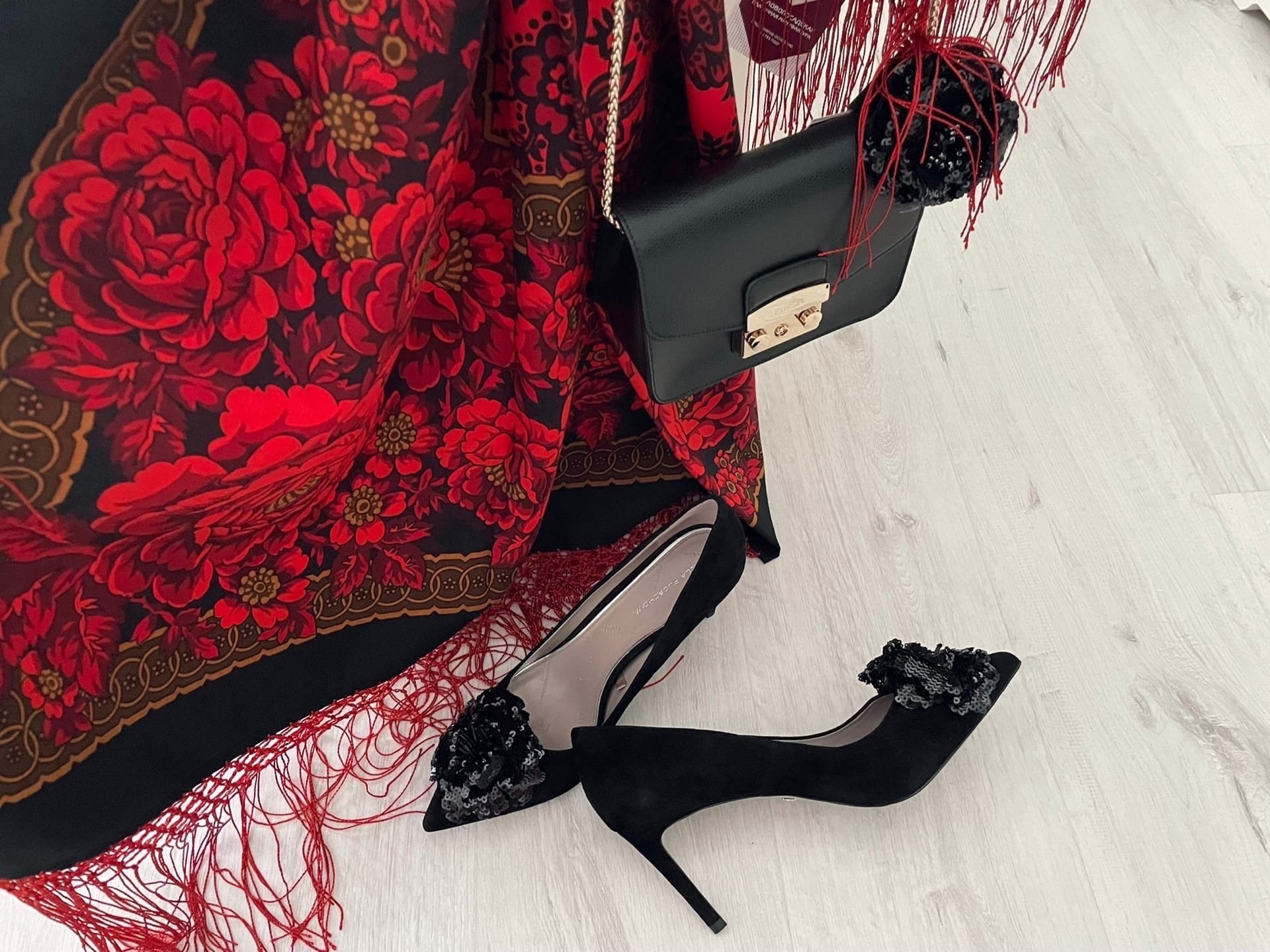 Зрелый возраст, Lilia, неоспорим с обеими парами туфель. Как же он хорош, да с красной бахромой! Харизматичный платок, люблю такие и тянет на такие, но уже стала последнее время как то сторониться, хочется для себя того что не добавляло бы годков, ну дак это ихмо. Думаю этот плат уже я так запросто не накину к лицу. Но нравится он, сил нет как! Уговариваю пока себя что дорого больно