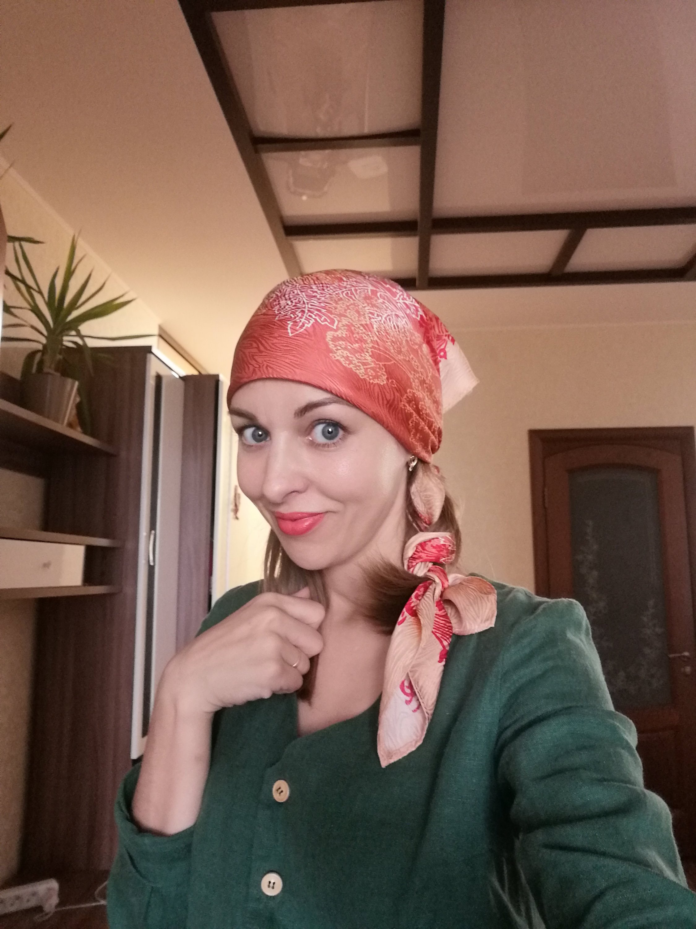 Очень понравились ваши показы! Так интересно сочетаются цвет платья и цвет платка. Казалось бы, совершенно разные, но тем не менее, как красиво! Молоденькая, хорошенькая! Вам платочек просто замечательно!